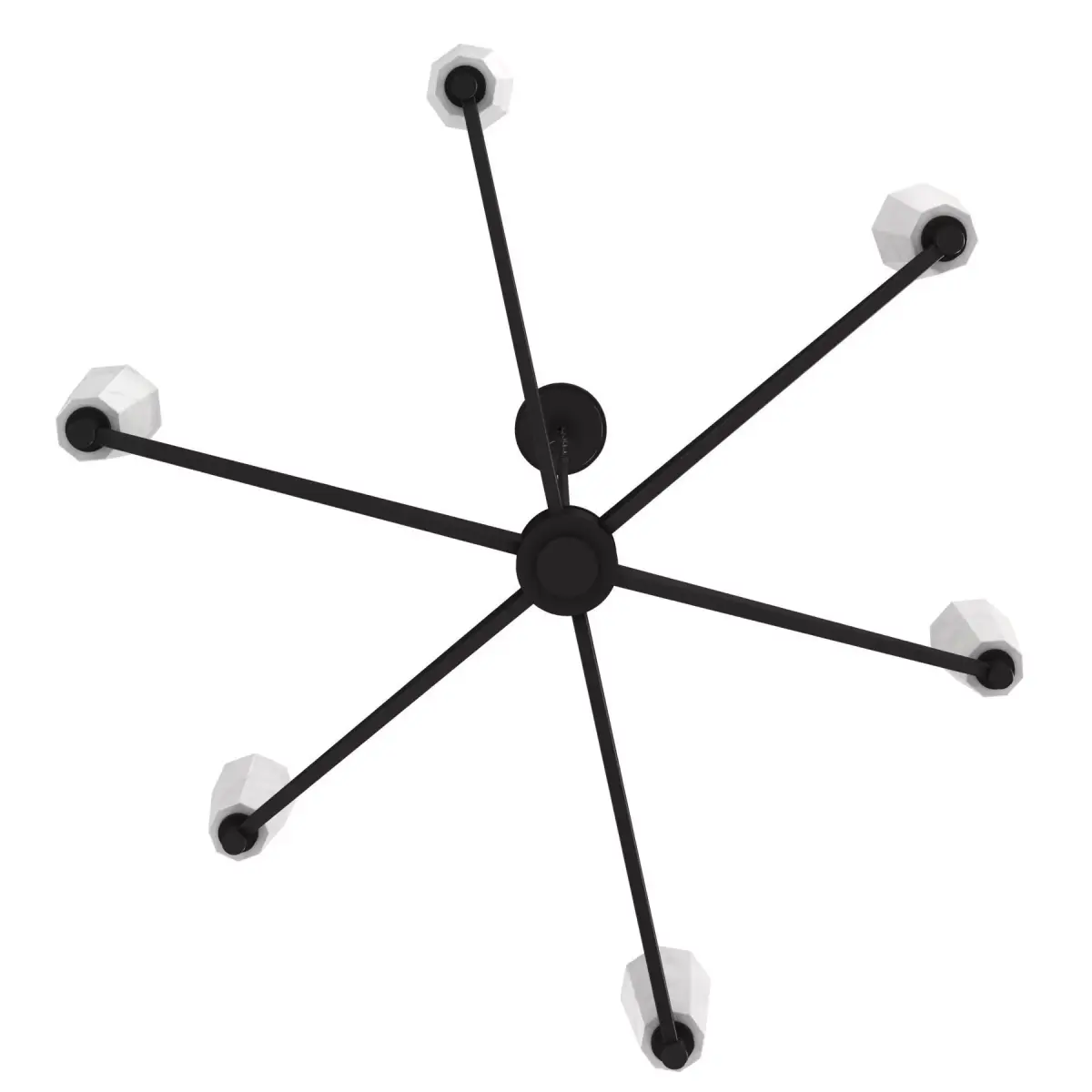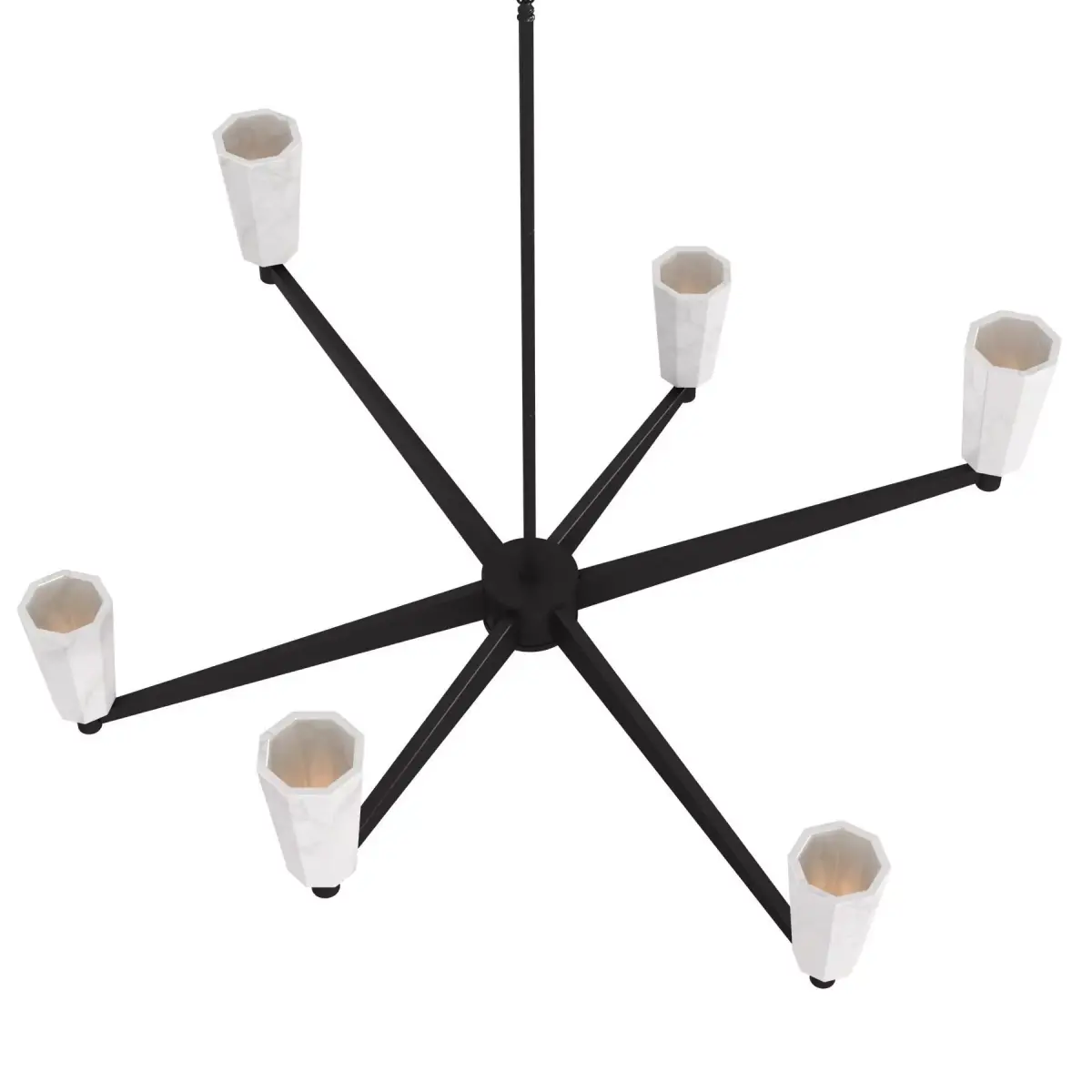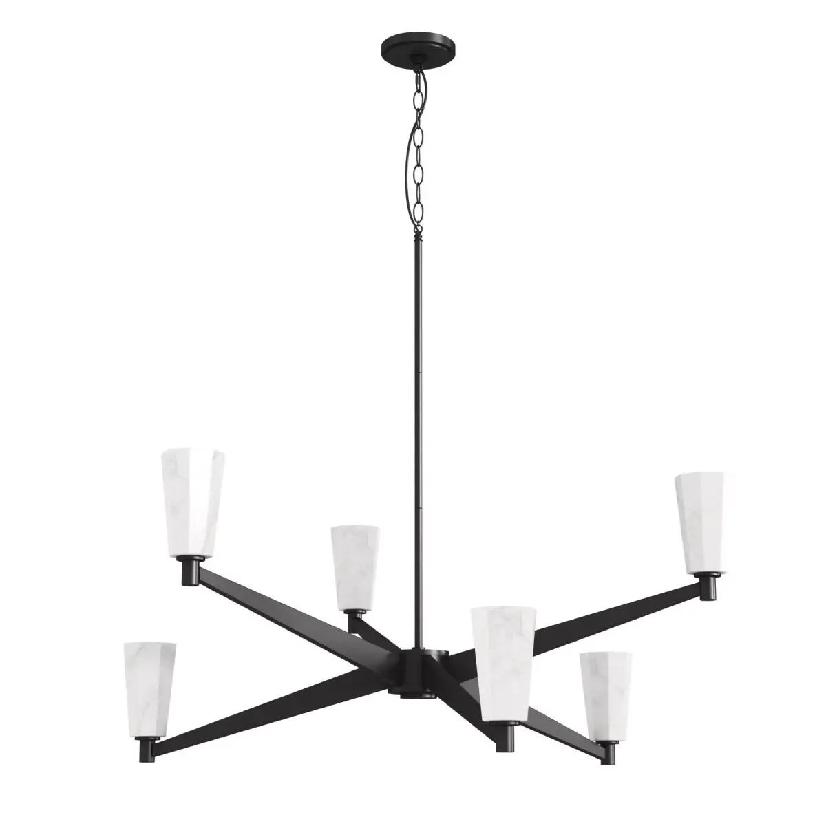 The chandelier's graceful design is perfect for dining rooms and great roomsThis stunning light is ideal for Modern Luxe and Soft Modern settingsA Matte Black finish enhances the fixture's striking silhouetteFaux alabaster shades radiate lovely patterns of light and textures when illuminatedThe scale and design of this fixture creates a captivating focal point in roomsUses (6) 60-watt max candelabra base bulbs or LED equivalent, that is sold separately, and dimmable when used in conjunction with a dimmable bulbMeasures 41-in. diameter by 16.12-in. heightOur 1-Year Limited Warranty guarantees your complete satisfaction with your purchase and includes professional after-sales customer service supportIncludes installation instructions and mounting hardware for a quick, easy installation