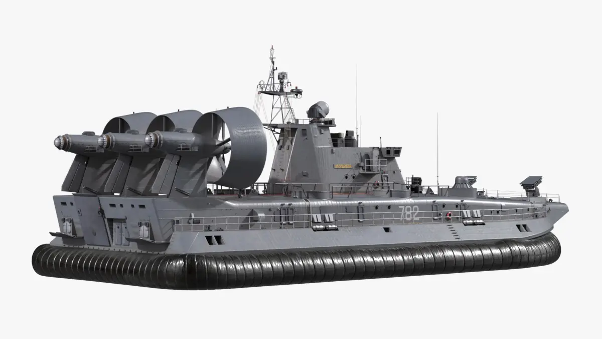 This model features a versatile design with large propellers and powerful engines that enable it to hover over various surfaces. Its robust hull and flexible skirt system allow it to transport troops, vehicles, and equipment over challenging terrains. Equipped with advanced navigation and communication systems, it ensures efficiency and reliability during military missions.