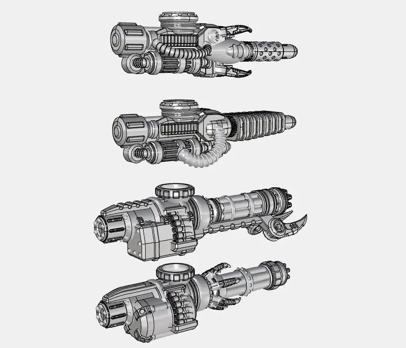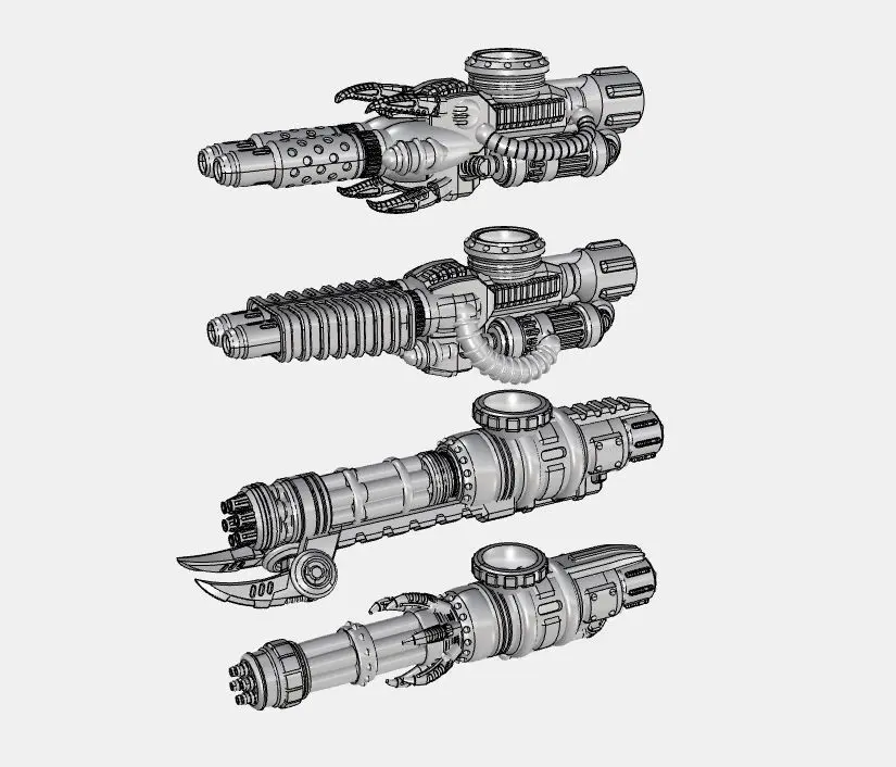 Parts include...-Right and Left Gatling Weapons (two types)-Two types of Dragon Spear weapons for punching through tanks.-Carapace weapons, both right and left, of melting guns and rotary stubby gatlings.