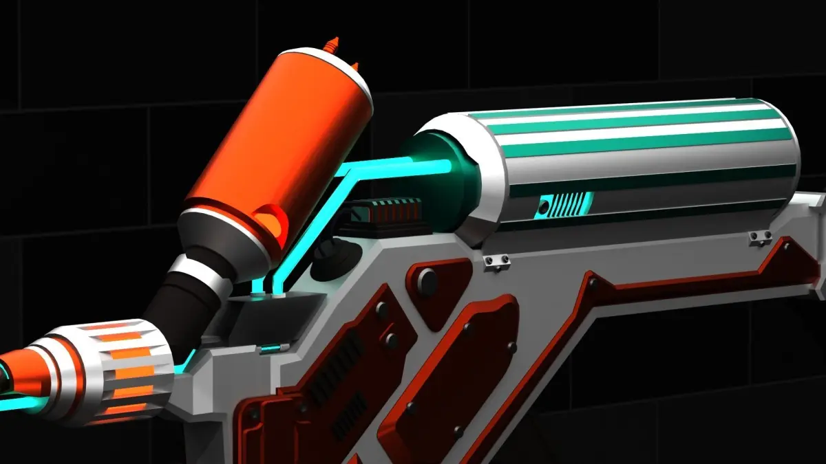 Mythical gun of aliens. We don't know what is this, but I think it's something like a flamethrower. After the first tests, we understand that red balloons are filled with gas, blue with the refrigerant. And we understand that a piezo is located under the barrel.