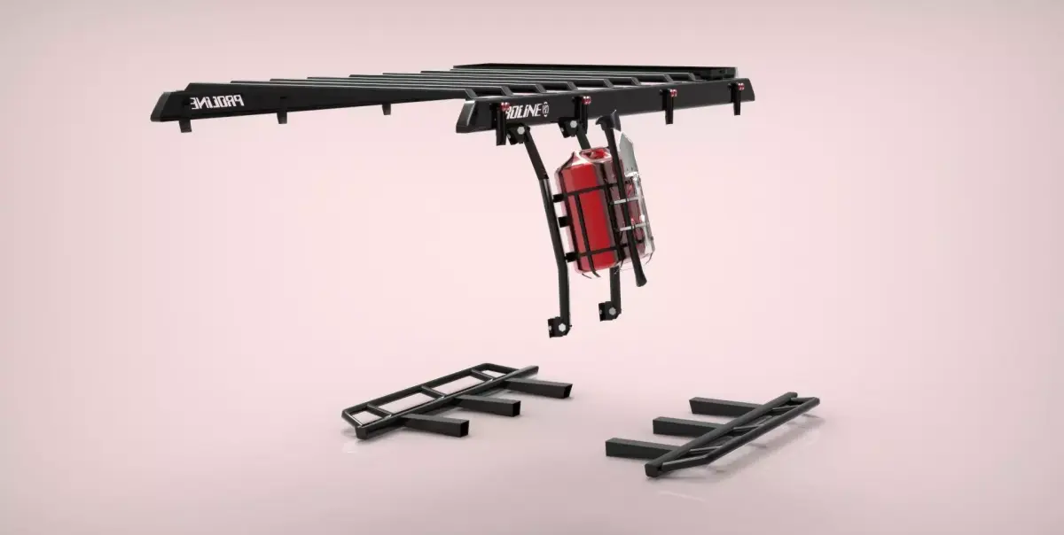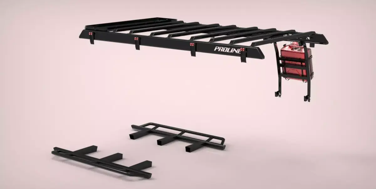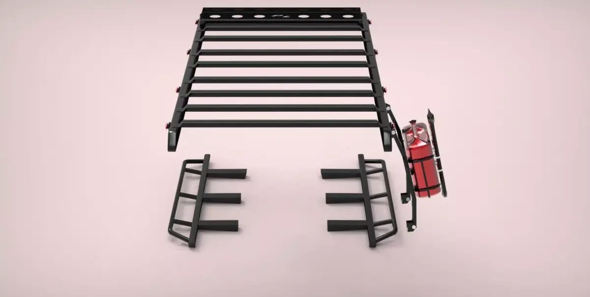 Accessories for Toyota Land Cruiser J76 series: Proline brand roof rack and lower side steps, accompanied by a fuel can holder and emergency 4x4 tool kit. It is very well-sized based on 3D models of the J76 series found online. Very well-made and optimized, the piece is lightweight, so it won't cause lag in games or simulators. These parts perform very well in any environment where you need them.