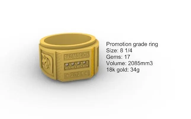 Anillo grado promocionTalla: 8 1/4Gemas: 17Volumen: 2085mm3Oro 18k: 34g