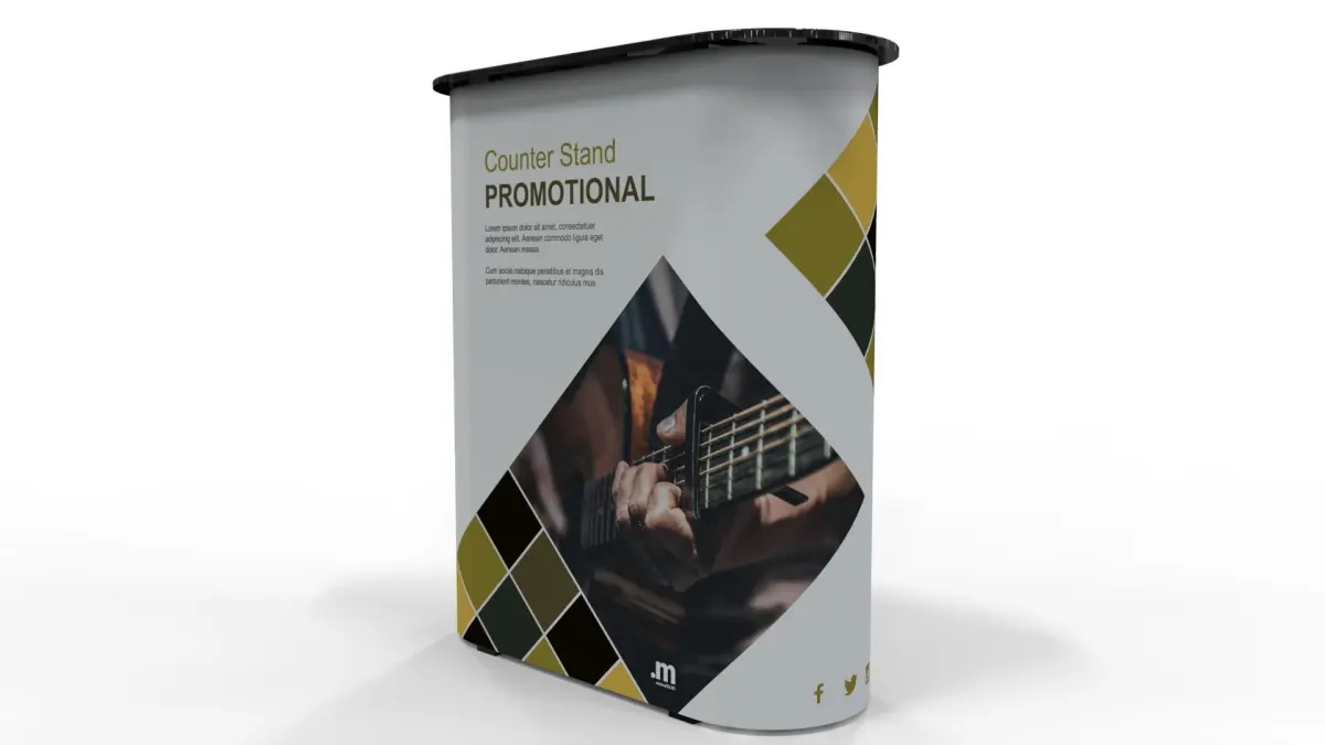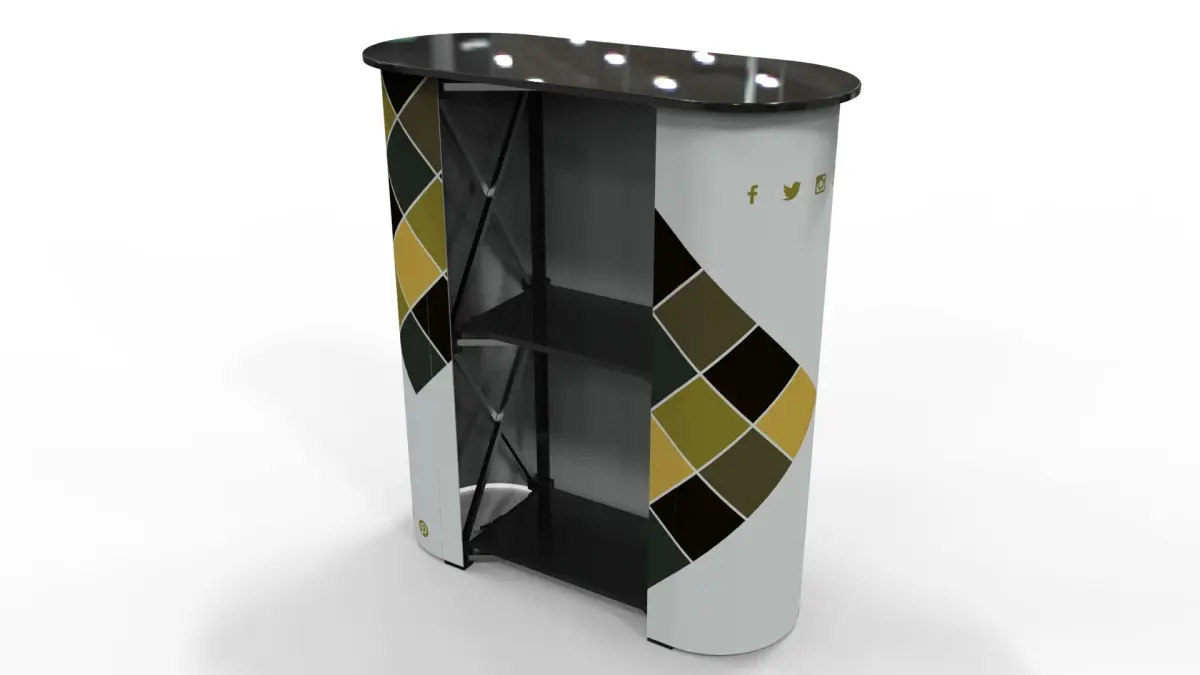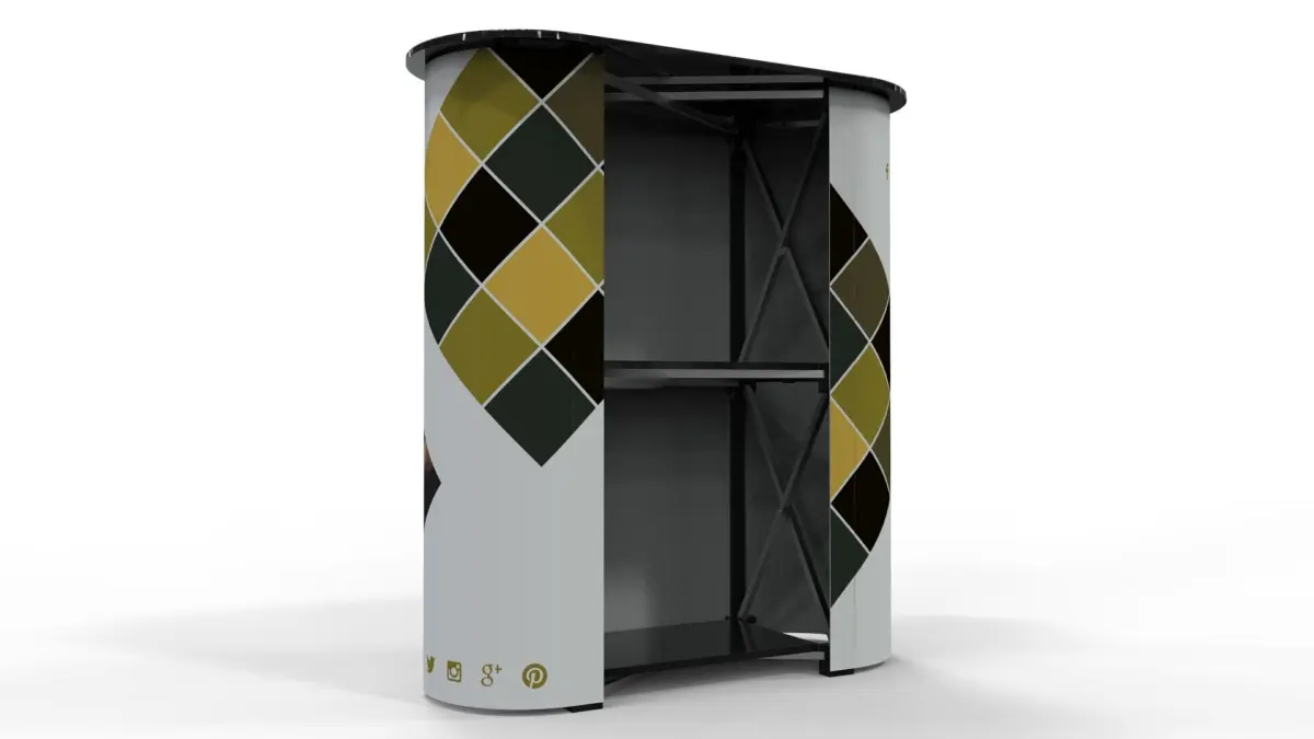 This 3D model represents a promotional pop-up counter stand designed for trade shows, product displays, and customer service points in high-traffic commercial environments. Its structure combines portability, easy assembly, and professional visual impact, making it ideal for use in exhibitions, retail stores, events, and public spaces.