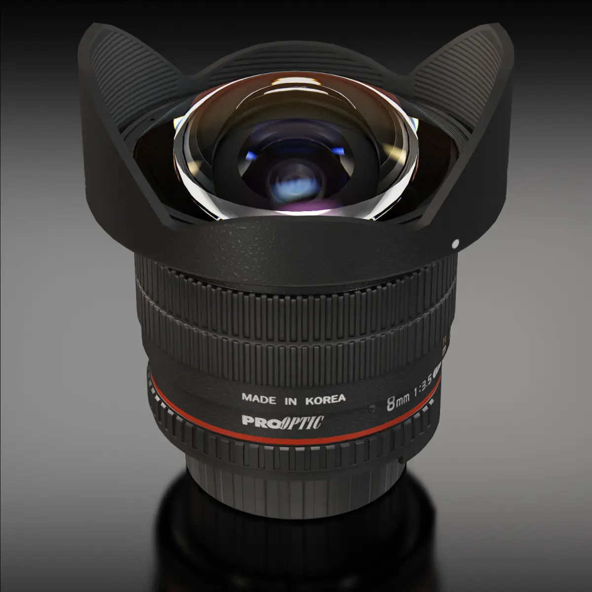 • Let me present to you high-quality low-poly 3D model proOPTIC 8mm f/3.5 AS IF UMC Fish-eye CS II AE Nikon F mount Lens. This model can be used in various fields 3D Graphics such as game development, advertising, interior design, motion picture art, visualization, etc... Modeling was made with ortho-photos of real lens that is why all details of design are recreated most authentically.