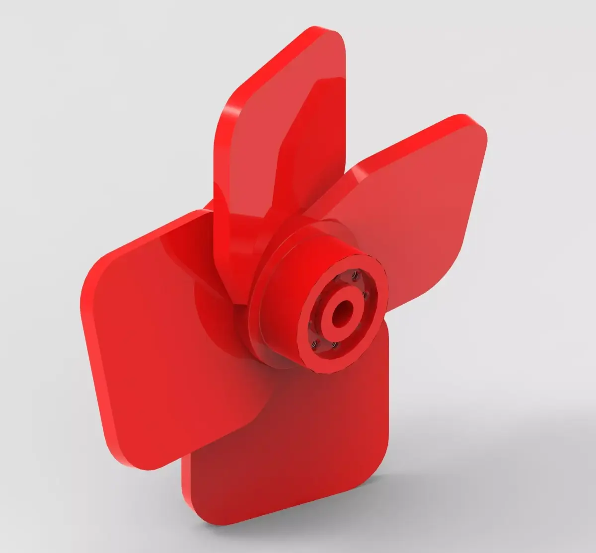The component represents an axial propeller, designed to allow airflow parallel to the rotation axis. The model is fully dimensioned in metric units (mm) and optimized for 3D printing fabrication.The main body features a central hub with eight M6 threaded holes, each 50 mm deep, intended for assembly with other parts. The geometry exhibits axial symmetry and an aerodynamic blade profile that enhances smooth air movement.This type of propeller is suitabe for experimental setups, fan systems, or airflow demonstrations, where the performance of an axial rotor produced by additive manufacturing can be analyzed.