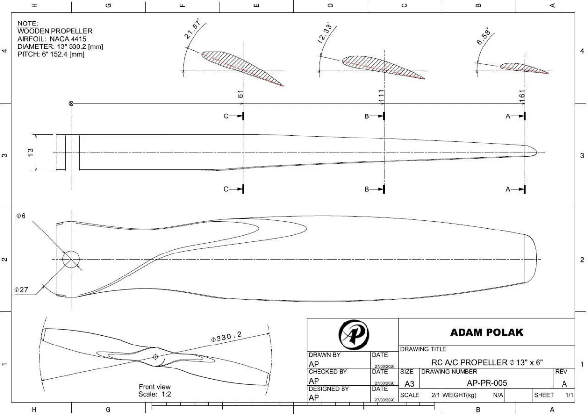 Ideal manufacturing method for this propeller is CNC machining of hard wood.The propeller must be balanced before use!