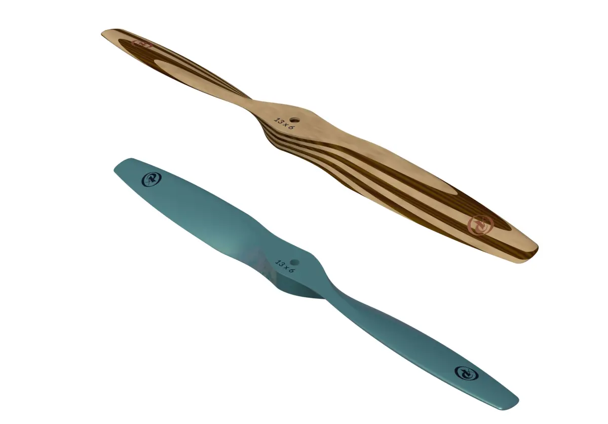 This traditional shape propeller of 13 inch in diameter is designed with small pitch of 6 inch but high effective pitch ratio (up to 85%) to be ideal option for gasoline engines with higher RPM.It has the optimal shape for historical RC models with relatively small drag and torque, but good thrust performance.