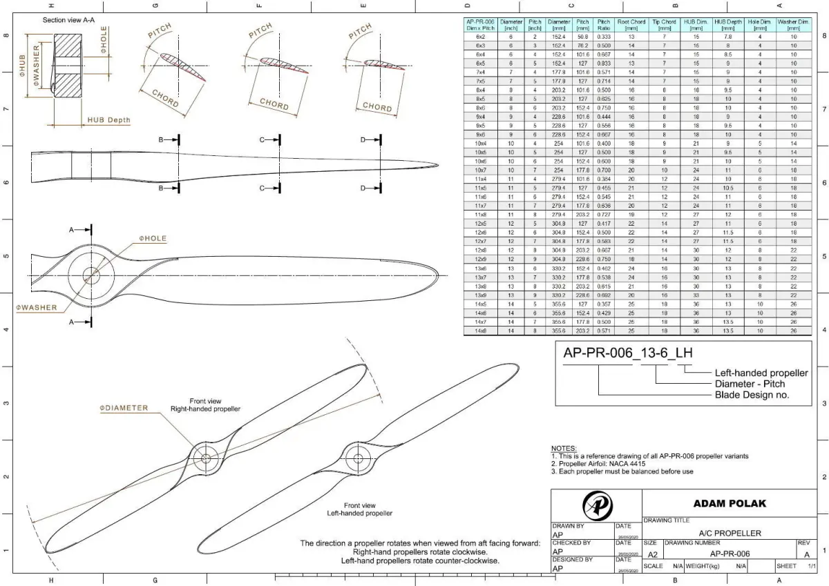 See attached reference drawing for Different Propeller sizes (Diameter and/or Pitch).