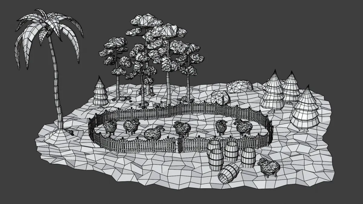 In the file you'll find 7 individual object as well as the landscape scene. Everything is properly named. The number of poligons is pretty low. Origins are placed correctly and normals have the right direction.