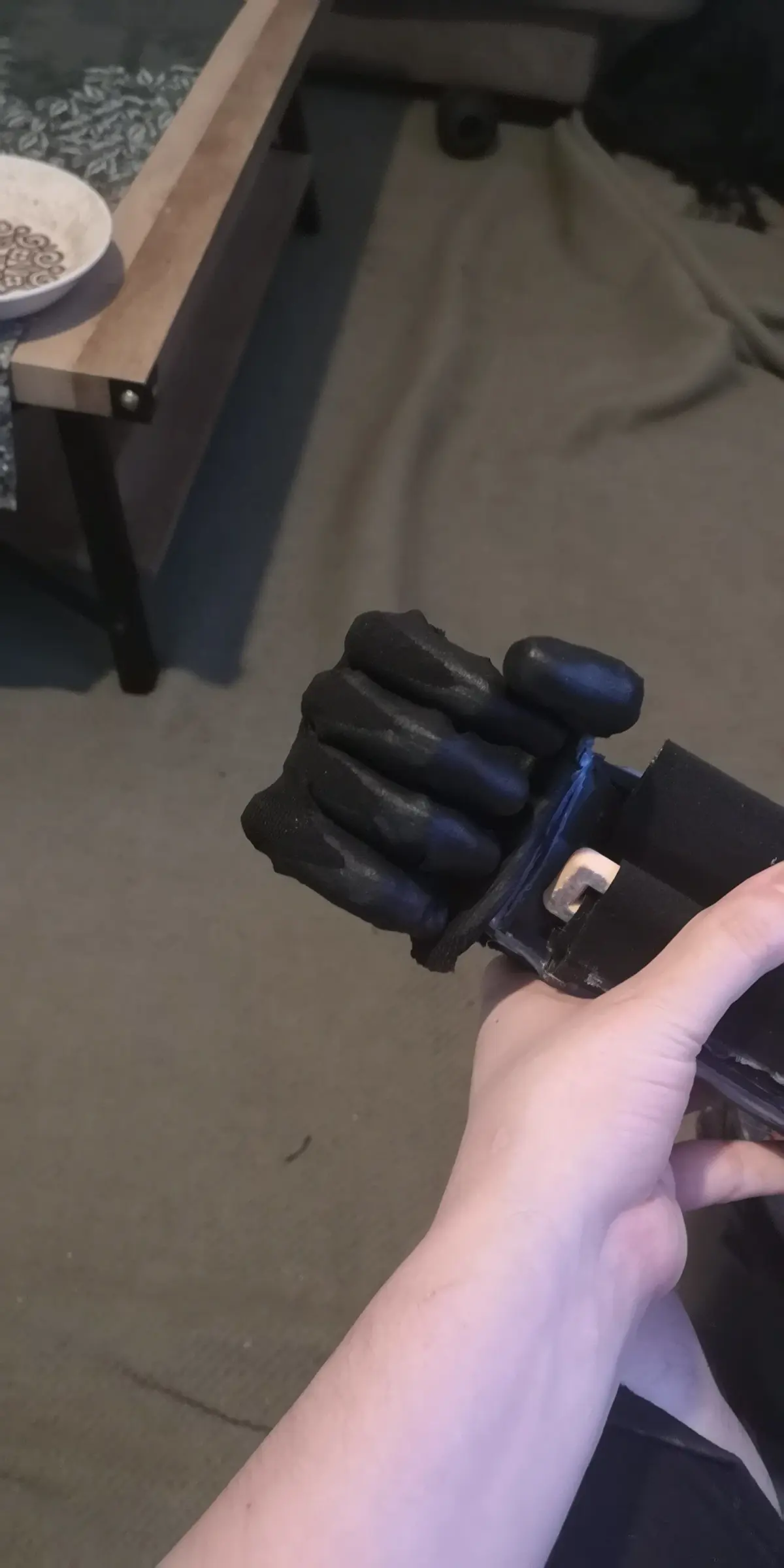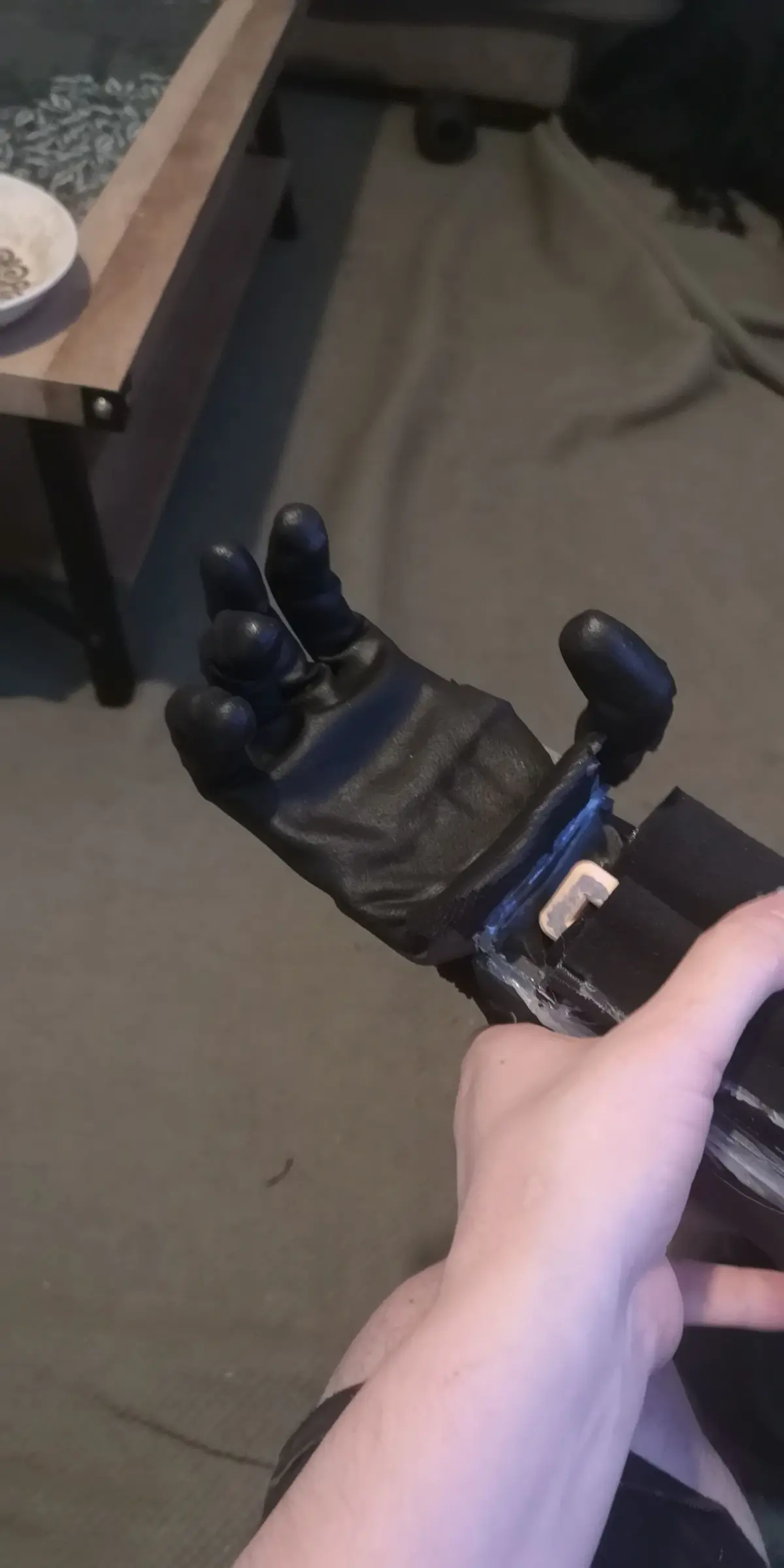 For putting the glove. Cut the thumb separate from the glove and pull the glove on the 4 fingers first. Hot glue to the palm stopper and wrist shield and this will keep the glove tight on the fingers. Do the same for thumb.
