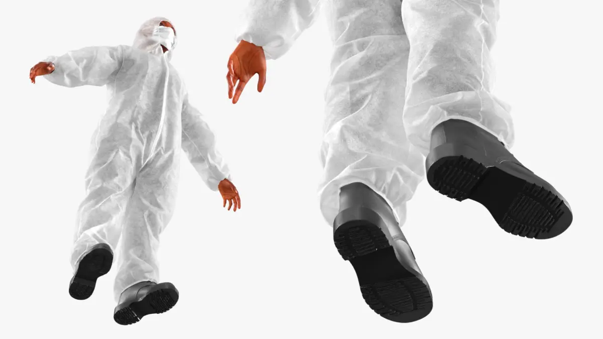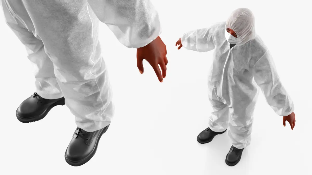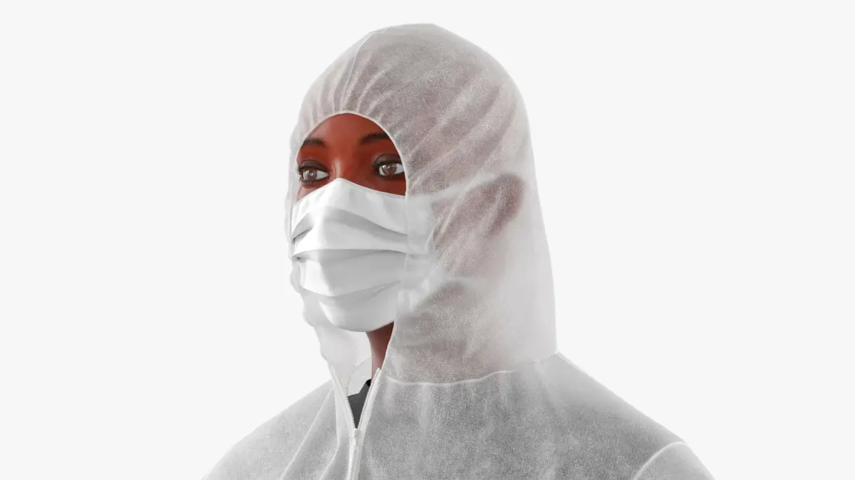 Protective Disposable Jumpsuit and Mask on Female Fur for Maya is a three-dimensional model of Black women in the full-body protective garment, commonly used in medical and industrial environments for health and safety purposes.