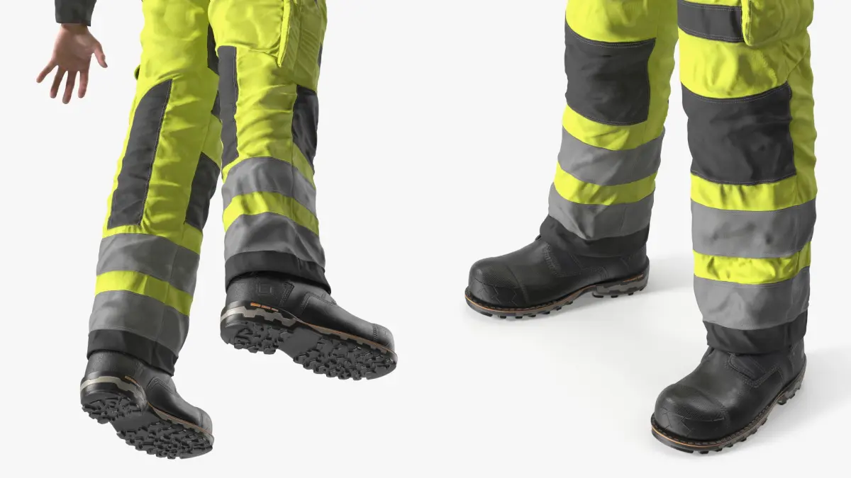 This model features a set of high-visibility garments, including a fluorescent jacket and pants, complemented with reflective strips strategically placed to enhance visibility. It also includes a hard hat and sturdy work boots.