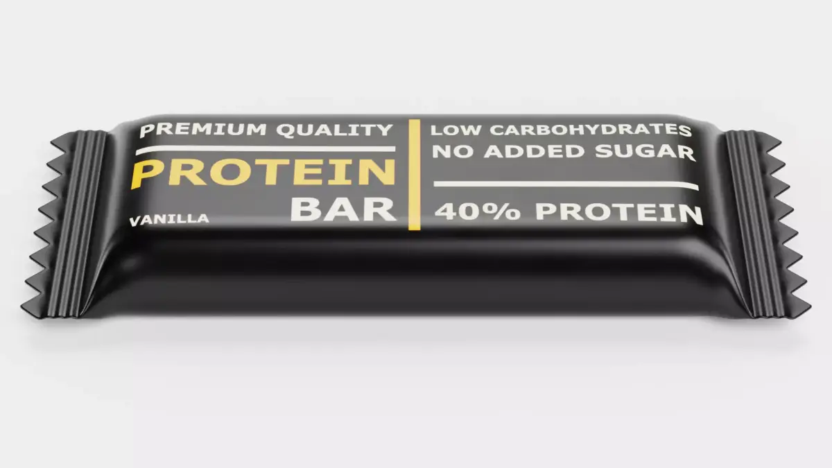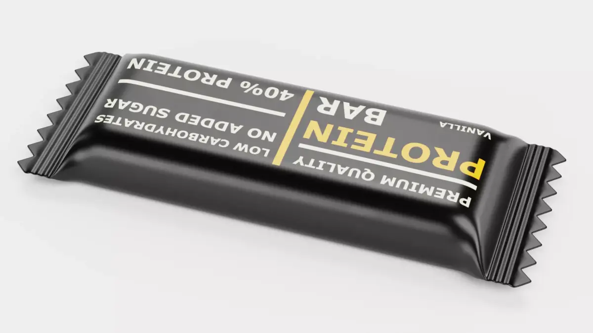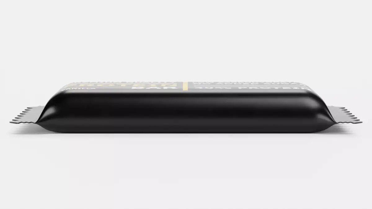 A realistic 3D model of a Protein Bar sealed flow wrap package designed as a brand-neutral supplement container with clean proportions and a production-ready look. This concept emphasizes modern, minimal design and accurate form factor, representing a timeless, professional packaging aesthetic for sport nutrition packaging – without any brand association.