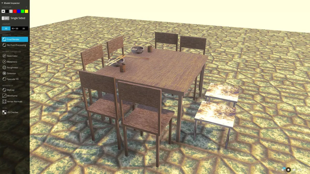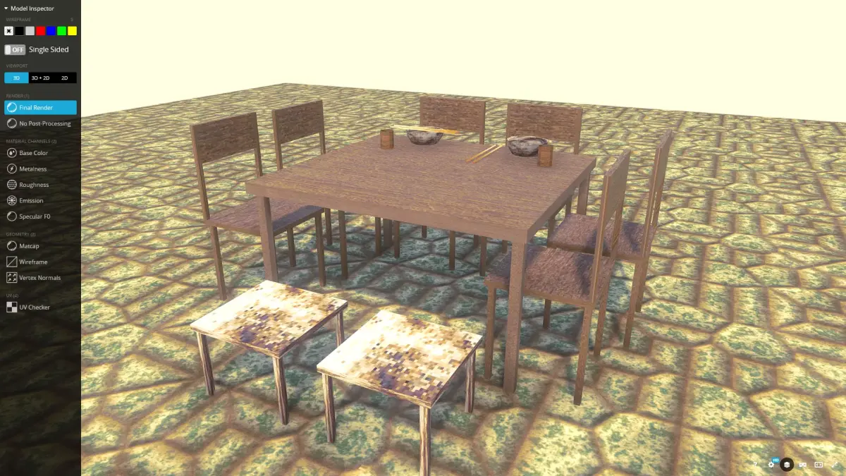 Dining Table: Rectangular wood table with a low tri-count.* 6 Dining Chairs: Includes variations for a modular look. Stools/Benches: Two small, separate stool models. Food Props: Bowls, plates, cups, and chopsticks—all styled to match the low-fidelity aesthetic.
