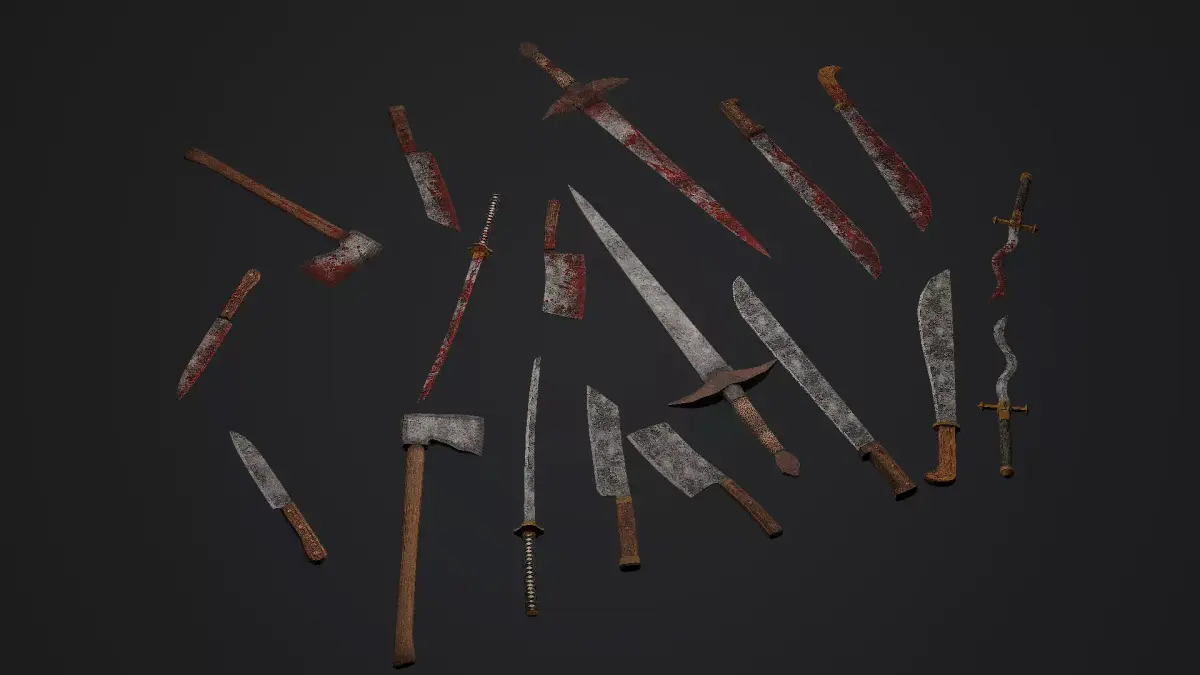 The collection includes classic melee weapons, farming tools, and unique stylized weapons. Every weapon has both clean and bloody versions available.