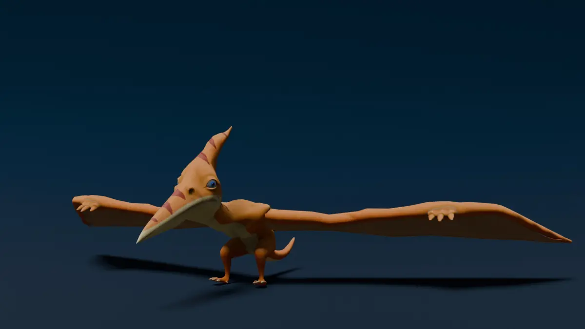 Pterodactyl (Stylized)" is a game-ready 3D model (8,383 tris) featuring 2K PBR textures (base color, normal, roughness) in a stylized art style. The rigged FBX file includes clean skinning for smooth animations and is ready for use in Unity, Unreal, or other engines—no LODs, fur, or cloth physics included. Perfect for stylized prehistoric or fantasy games.