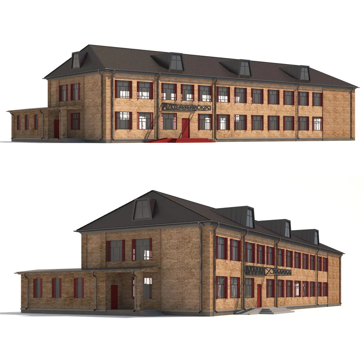 Public building.Brick building 2 floors.Polys 1786996Verts 1984242Public buildingArchive:Max 2014OBJRender: V-ray 3.40.01Texture in the archive. The materials are set up.