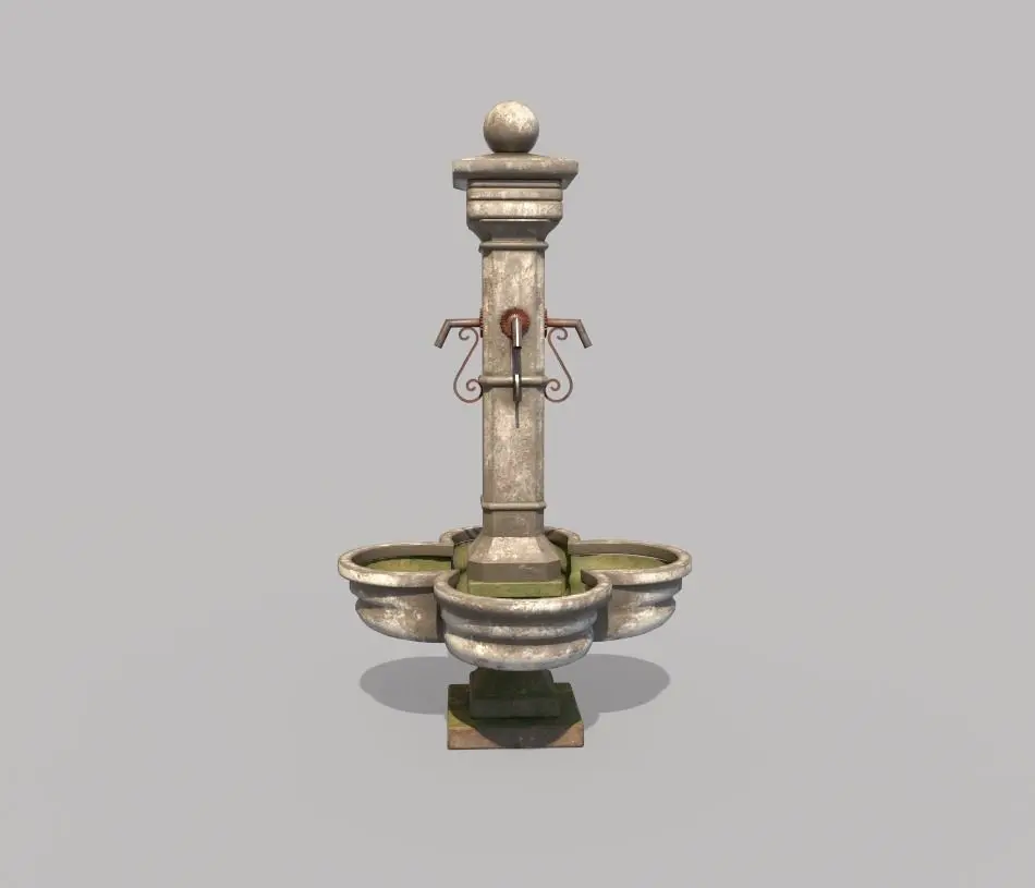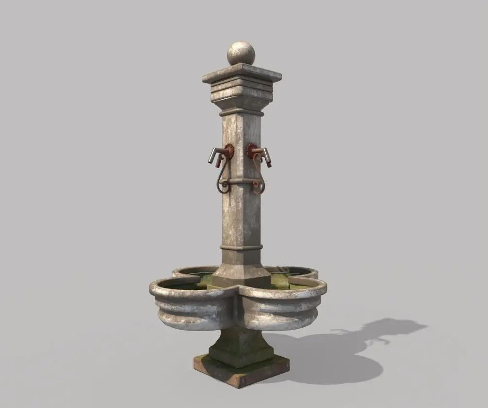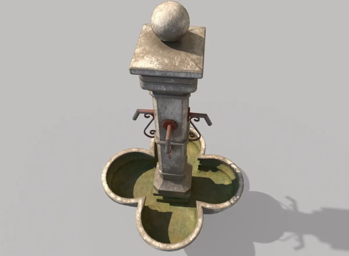 Model of public fountain . Model is very realistic.It has 3 PBR material.Maps are diffuse-specular-glossiness-height and normal. Model's textures has two sizes; 4096x4096-2048x2048. All maps are PNG formats .UE4 converts (4096x4096) are included.Record formats: MAX OBJ 3DS FBX