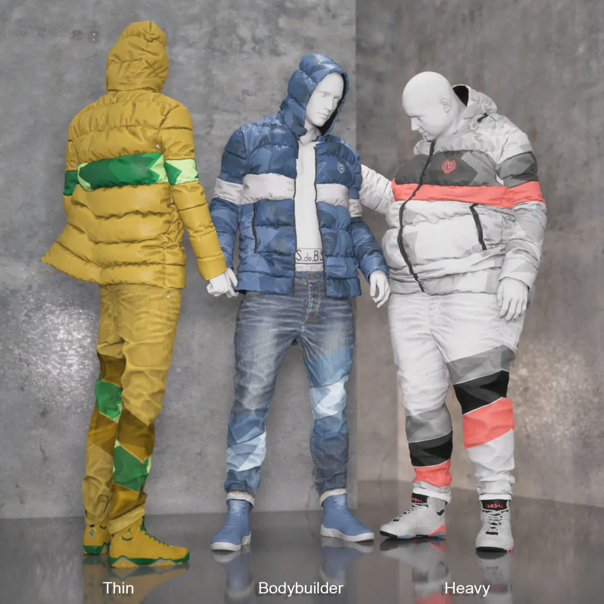 Morphs & Styles:- 9 Puffer Morph Options- 2 Jeans Morph Options- 2 Shoes Morph Options