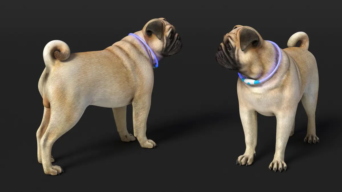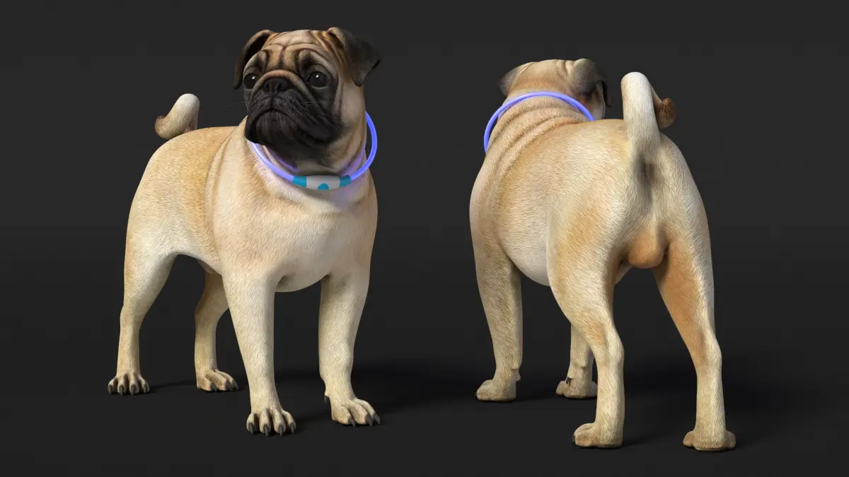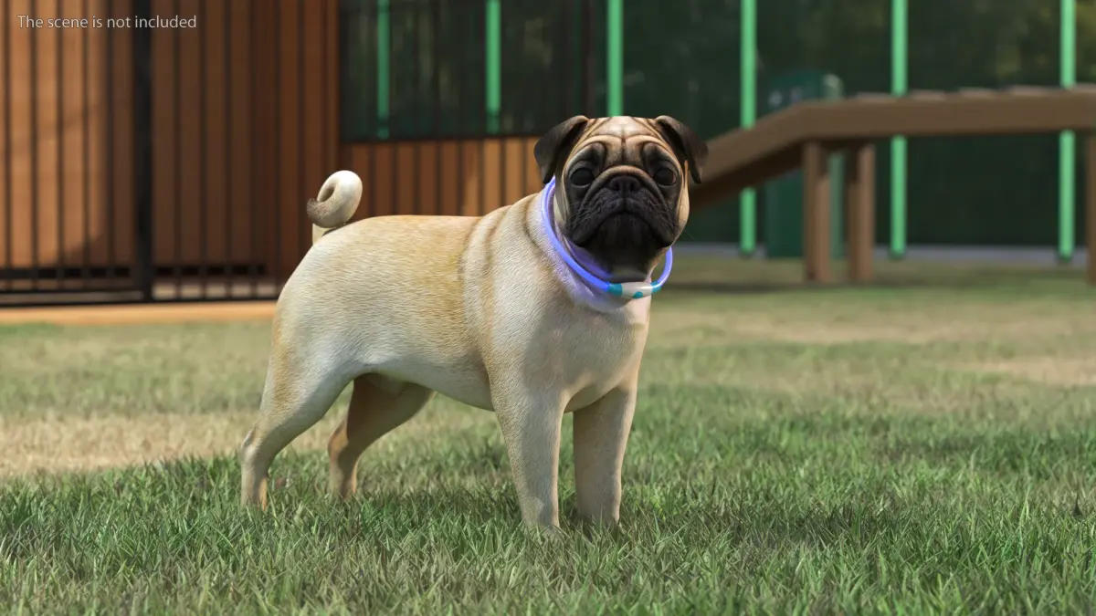 Pug Dog in LED Collar is a three-dimensional model of pug wearing an illuminated LED collar, designed to enhance visibility and safety in low-light environments.