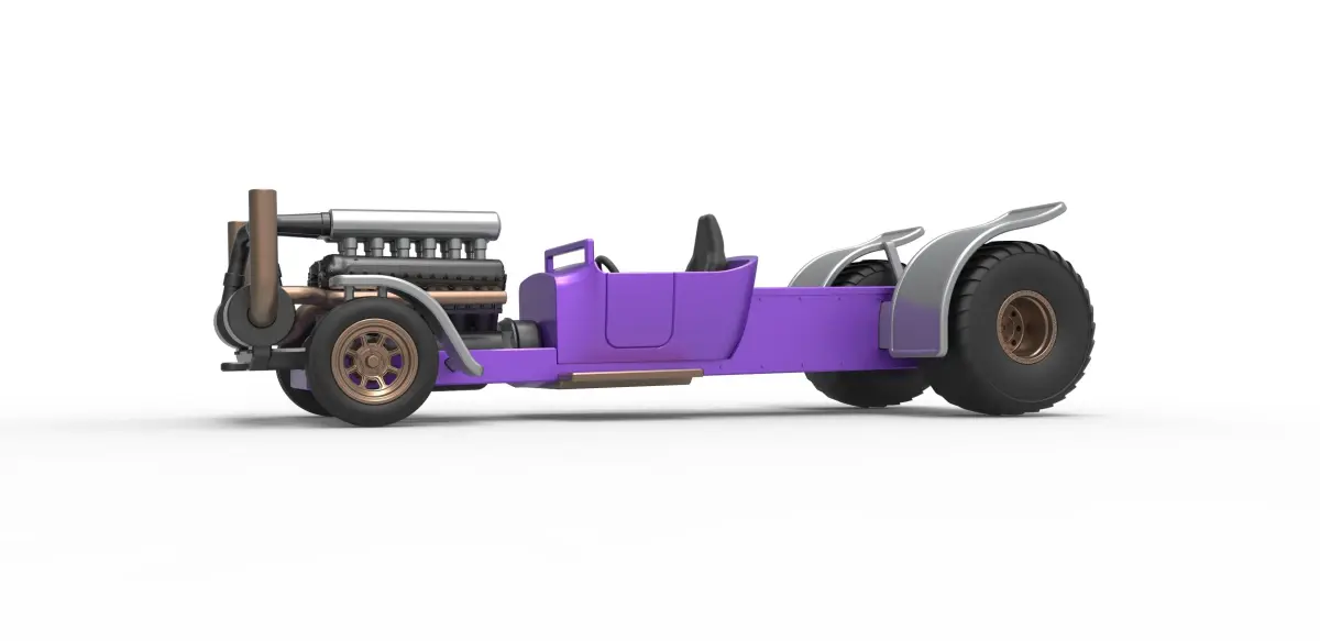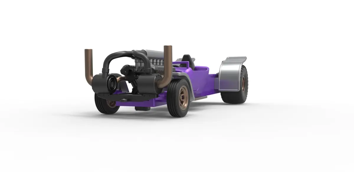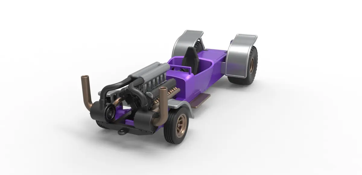 The model consists of parts: Body, Bottom insert, Engine front part, Engine main part, Engine top part, Front left fender, Front right fender, Front rims, Front tires, Gear shifter, Left exhaust pipe, Rear left fender, Rear right fender, Rear rims, Rear tires, Right exhaust pipe, Seat, Shell, Side exhaust pipes, Steering wheel.