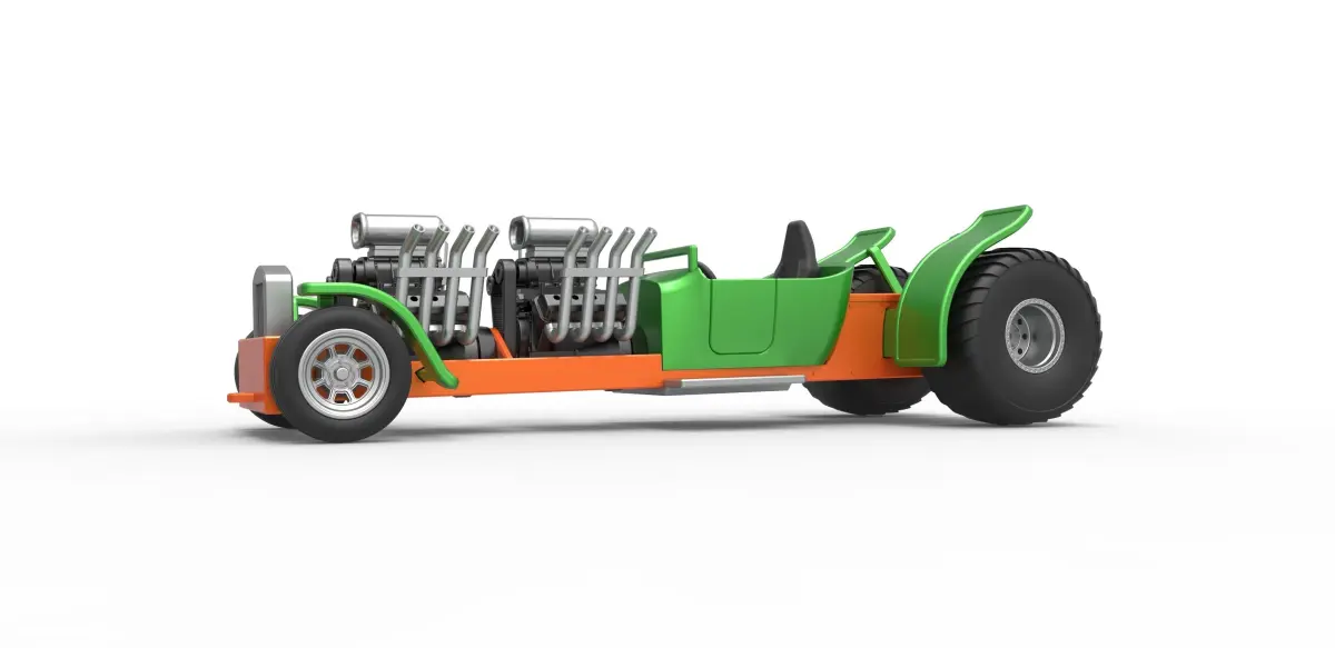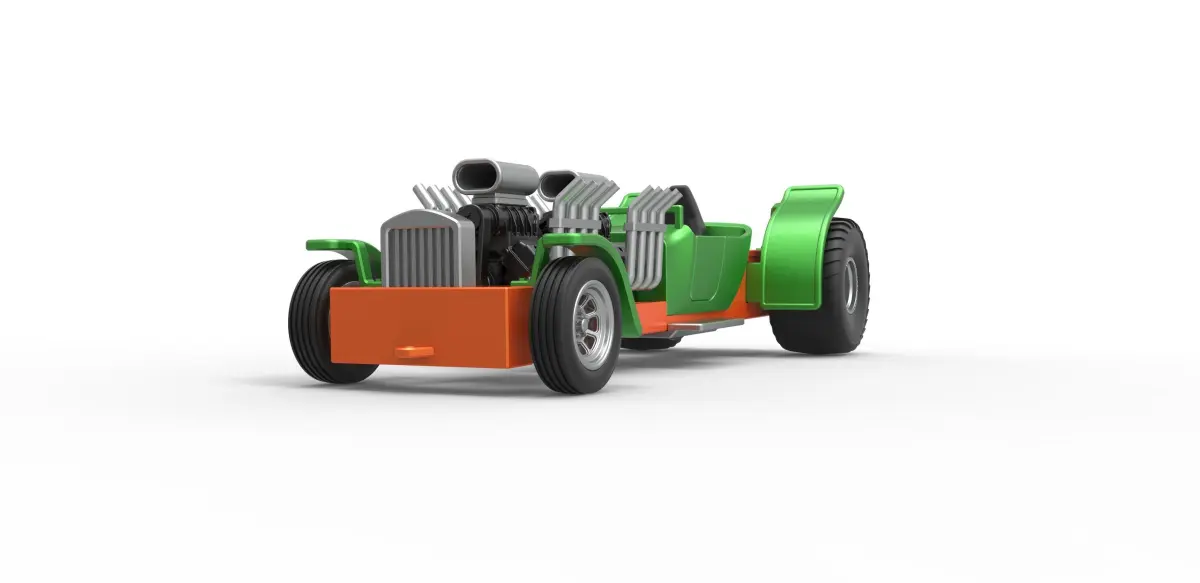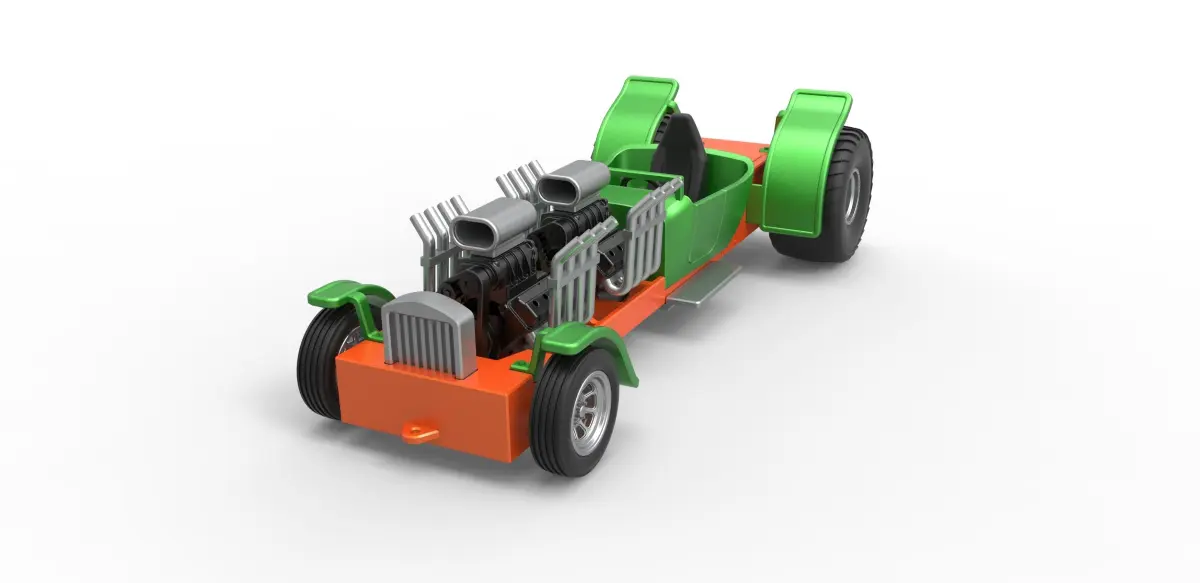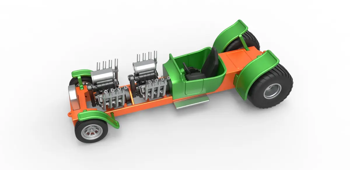 The model consists of parts: Air intake, Bottom insert, Engines, Frame, Front left fender, Front right fender, Front rims, Front tires, Gear shifter, Left exhaust pipes, Radiator, Rear left fender, Rear right fender, Rear rims, Rear tires, Right exhaust pipes, Seat, Shell, Steering wheel, Weight.