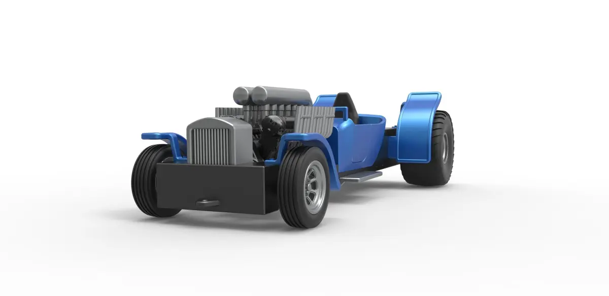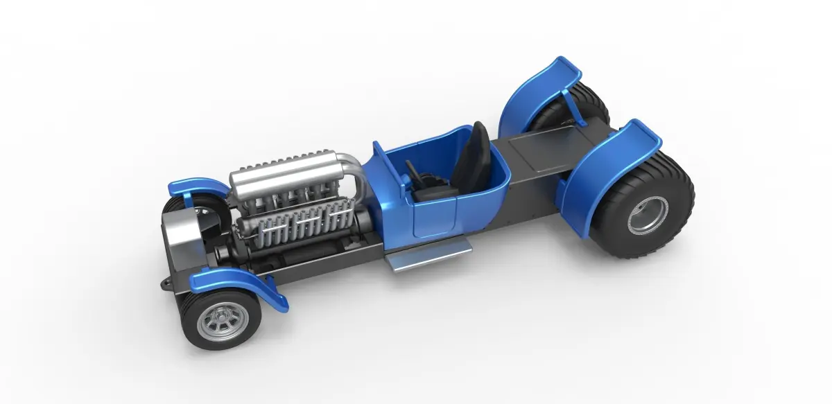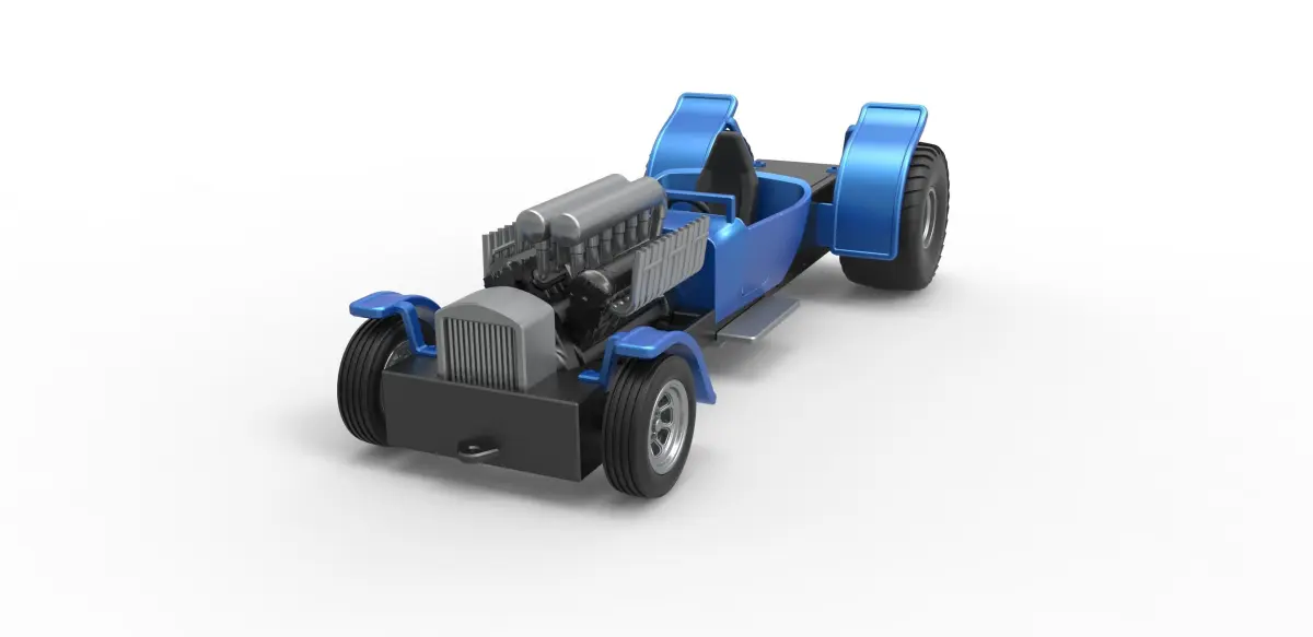 The model consists of parts: Bottom insert, Engine main part, Engine top part, Frame, Front left fender, Front right fender, Front rims, Front tires, Gear shifter, Left exhaust pipes, Radiator, Rear left fender, Rear right fender, Rear rims, Rear tires, Right exhaust pipes, Seat, Shell, Steering wheel, Weight.