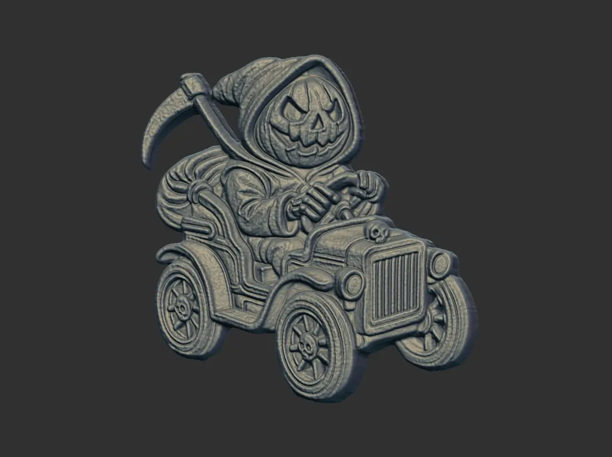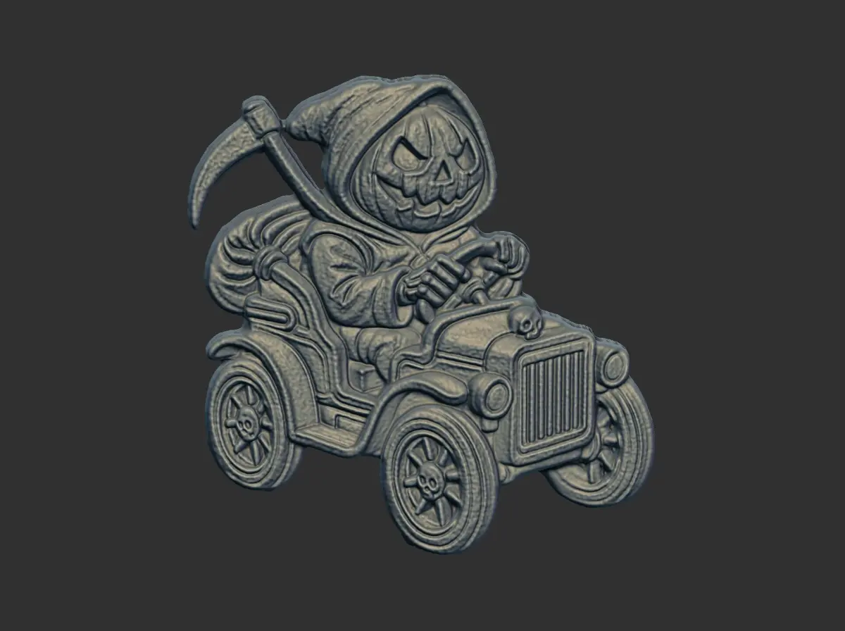 The image depicts a three-dimensional digital rendering of a Halloween-themed character driving an old-fashioned car. The character has a pumpkin for a head, carved with a classic jack-o'-lantern face, and wears a hooded cloak, reminiscent of the Grim Reaper, complete with a scythe slung over its back. The car is a vintage model, possibly inspired by early 20th-century designs, featuring details like spoked wheels with skull emblems and a skull ornament on the radiator. The rendering style suggests it could be a model for 3D printing or a design for a video game or animation. The monochromatic gray color scheme and the lighting give the image a sense of depth and texture, highlighting the details of the model.
