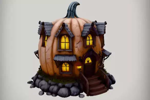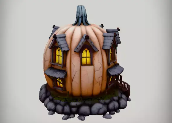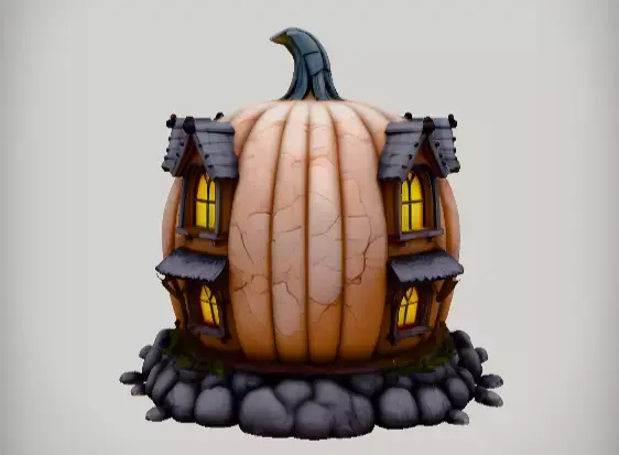 Cartoon-style pumpkin-shaped Halloween house