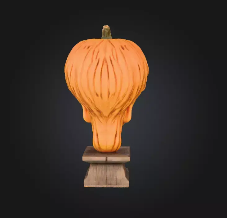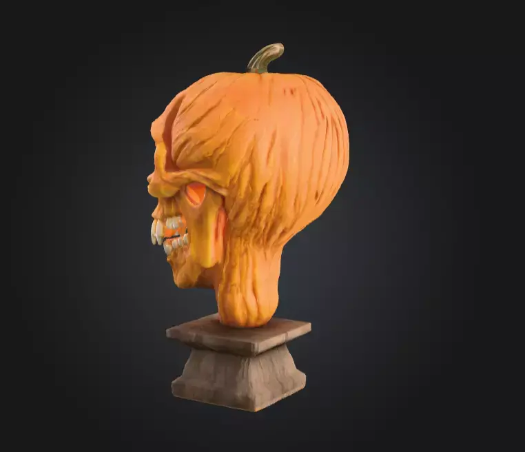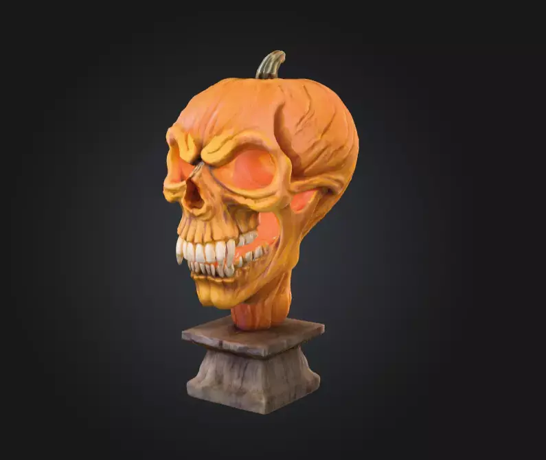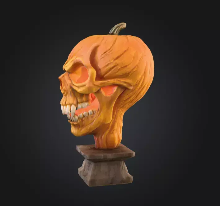 This model showcases exceptional sculptural detail. The head is a perfectly formed pumpkin that merges seamlessly with a human skull, creating a grotesque yet fascinating hybrid. Deeply carved eye sockets and nasal cavities echo traditional jack-o’-lantern cuts, while sharp cheekbones and pronounced teeth turn it into a fearsome skeletal visage. The texture of the pumpkin skin is richly layered with natural ridges, subtle cracks, and organic gradients, capturing the look of an autumn gourd at its ripest. Meanwhile, the skeletal structure within is rendered with bone-like precision, including realistic teeth and inner jaw detailing that seem ready to come alive.