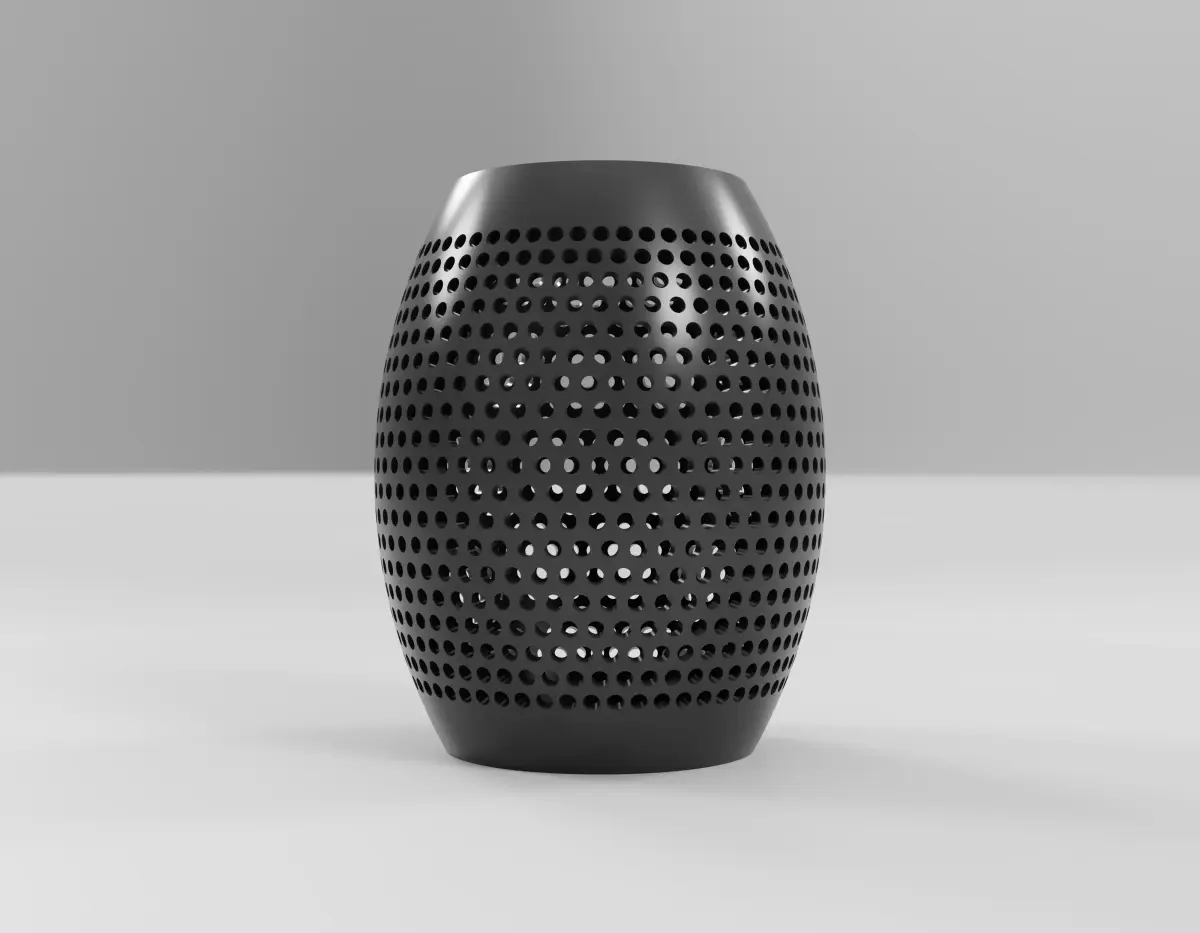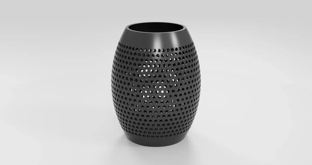 These represents a sophisticated exploration of transparency and pattern. Designed with a barrel-shaped silhouette, these vessels utilizes an intricate perforated mesh to create a play between solid form and open space. In this way, the perforations allows for unique light filtration, casting intricate shadows and revealing the interior volume of the vases. They have a Moire Effect when viewed from different angles, the overlapping patterns of the front and back create a mesmerizing visual depth. The clean, repetitive geometry makes an ideal piece for contemporary office spaces or modern home shelving.