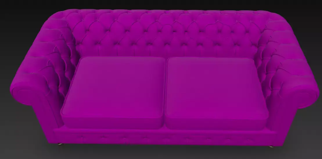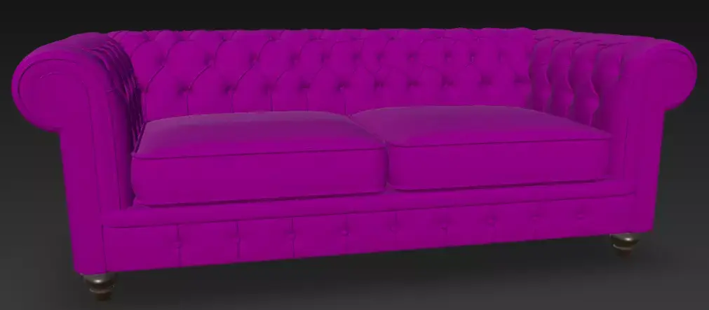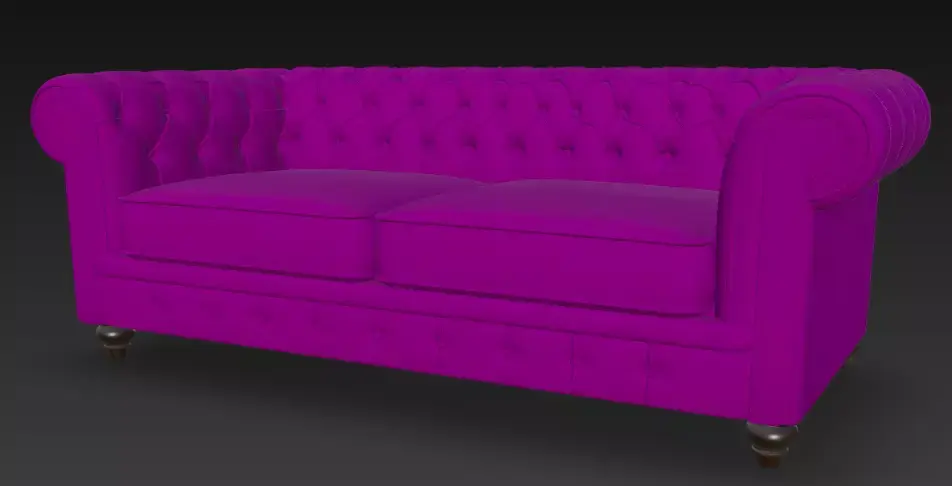This 3D model presents a charming purple Chesterfield sofa with detailed tufting, rolled arms, and sturdy wooden legs, perfect for stylish interior design projects. The model features smooth leather textures and a playful yet elegant design, ideal for virtual staging or unique furniture visualization.