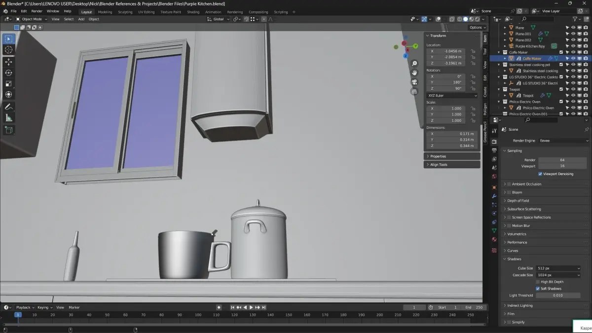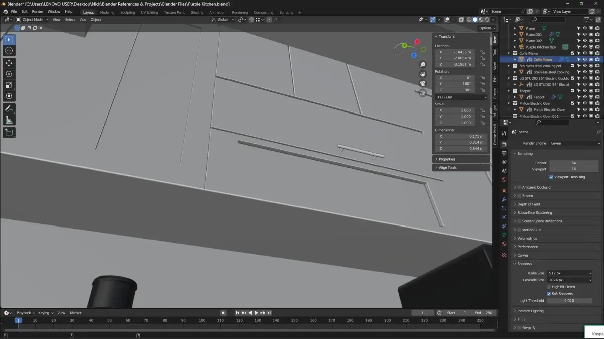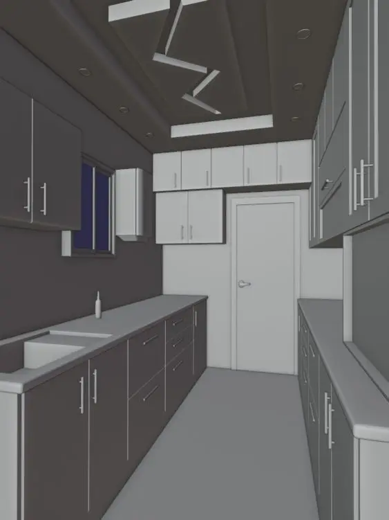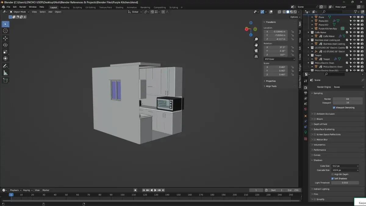 This is a complete 3D model of a kitchen interior.It includes: Cabinets, A Microwave, A Coffee Machine, An Electric Stove, etc.It has an verall theme of purple and white with its door, cabines. floor and walls being textured that way.It is a typical narrow and long kitchen with everything a standard kitchen would need.The kitchen was modeled in Blender and as such the lights have already been set up to give the same result as is seen in the image when rendered in Blender.