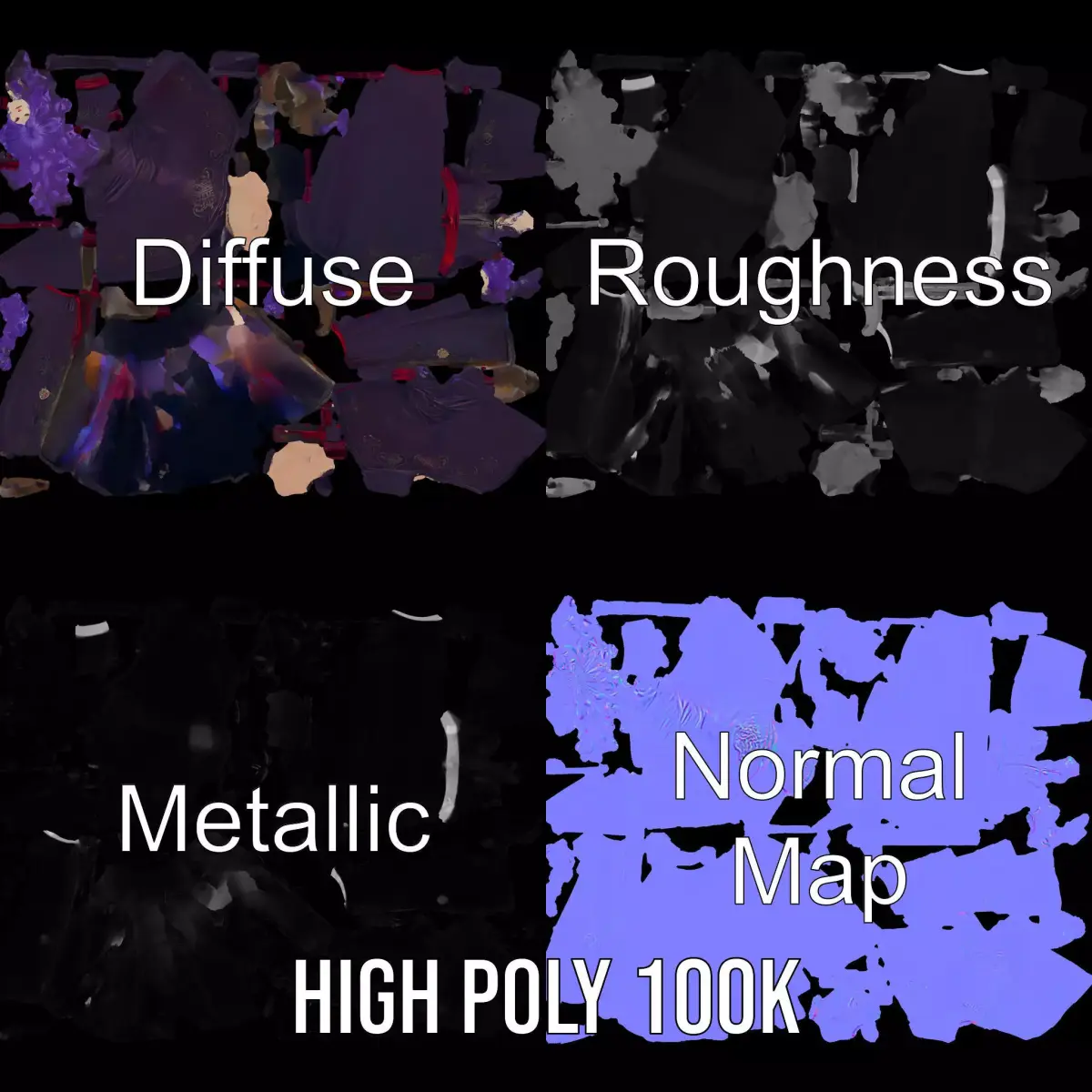 This intricately designed Purple Sorceress Robe model pack captures the essence of mystical elegance. Perfect for fantasy scenes, character design, and cinematic visualizations. Each model has 3 levels of detail: low-poly(1000 triangles for mobile), middle-poly(10 000 triangles for environment), and high-poly(100 000 triangles), which allows for the use of this model in production rendering(such as 3ds Max, Maya, Cinema4D, Blender, Vray/Corona/Cycles and all other), game engines (Unity and Unreal compatible), and interactive presentations, providing a choice of detail based on the LOD System principle. The model's textures are PBR, Diffuse, NormalMap, and reflection/roughness/metallic, which are suitable for any modern rendering engine. All models accurately unwrapped and have no overlapping UV. All textures are 4096*4096 in size. If you like this model, please like and leave a comment.