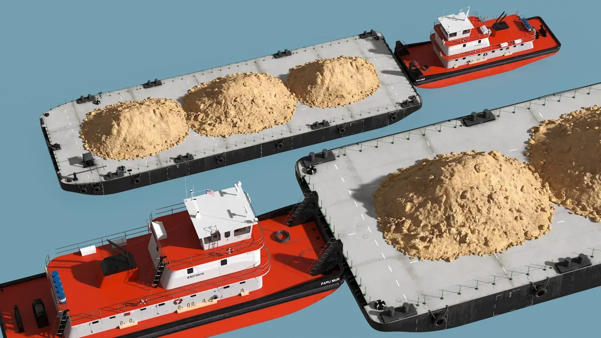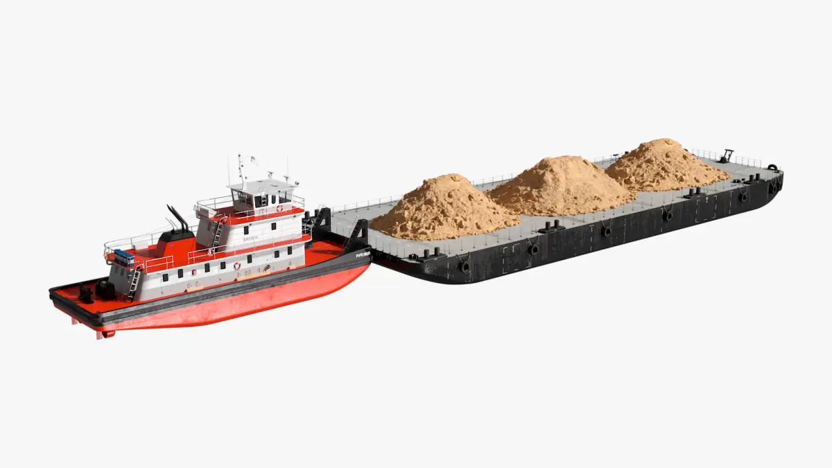 This tug boat and barge system showcases a robust structure with a detailed cabin, navigational equipment, and a spacious barge loaded with sand. It reflects the practical design of vessels used in marine logistics, emphasizing utility and the capacity to move heavy loads efficiently.