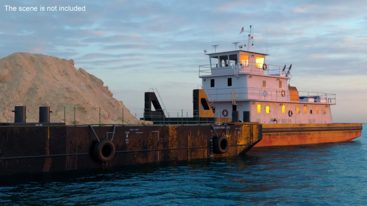 Push Boat Ship and Cargo Barge with Sand is a three-dimensional model of a maritime vessel used for hauling bulk materials, specifically designed to transport sand over waterways.