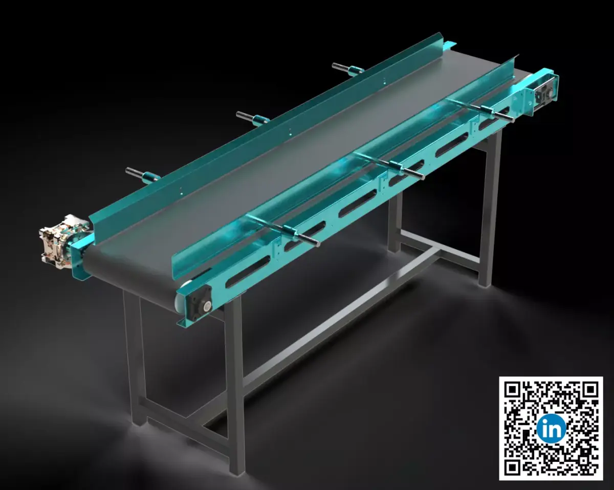 Key Specifications:Conveyor Belt: PVC material with a 400 mm width, 4460 mm length, and 3 mm thickness.Frame Structure: Constructed from aluminum and steel, with overall dimensions of 2270 mm (L) x 1100 mm (W) x 1050 mm (H), providing an effective conveying length of 1940 mm.Mechanical Drive: Features an NMRV050 i20 gearbox compatible with 0.5 HP motors and a 25 mm drive shaft diameter. Equipped with UST205 & USF205 bearings for smooth and reliable operation. Speed is customizable by installing a compatible motor and gearbox with a 25 mm input shaftDesign Features:All parts, including sub-numbered welded components, are logically named and organized within the FeatureManager Design Tree for easy modification and understanding. The model is supplied as a final design ready for manufacuturingIdeal Application:This model is perfect for a wide range of material handling and packaging applications across various industries, provided the conveyed materials operate within the PVC belt's temperature tolerance limits.Intended Use:Primarily engineered for direct physical manufacturing, this package provides all the necessary files to build a functional conveyor. Its high detail also makes it suitable for industrial visualization and design reviews.