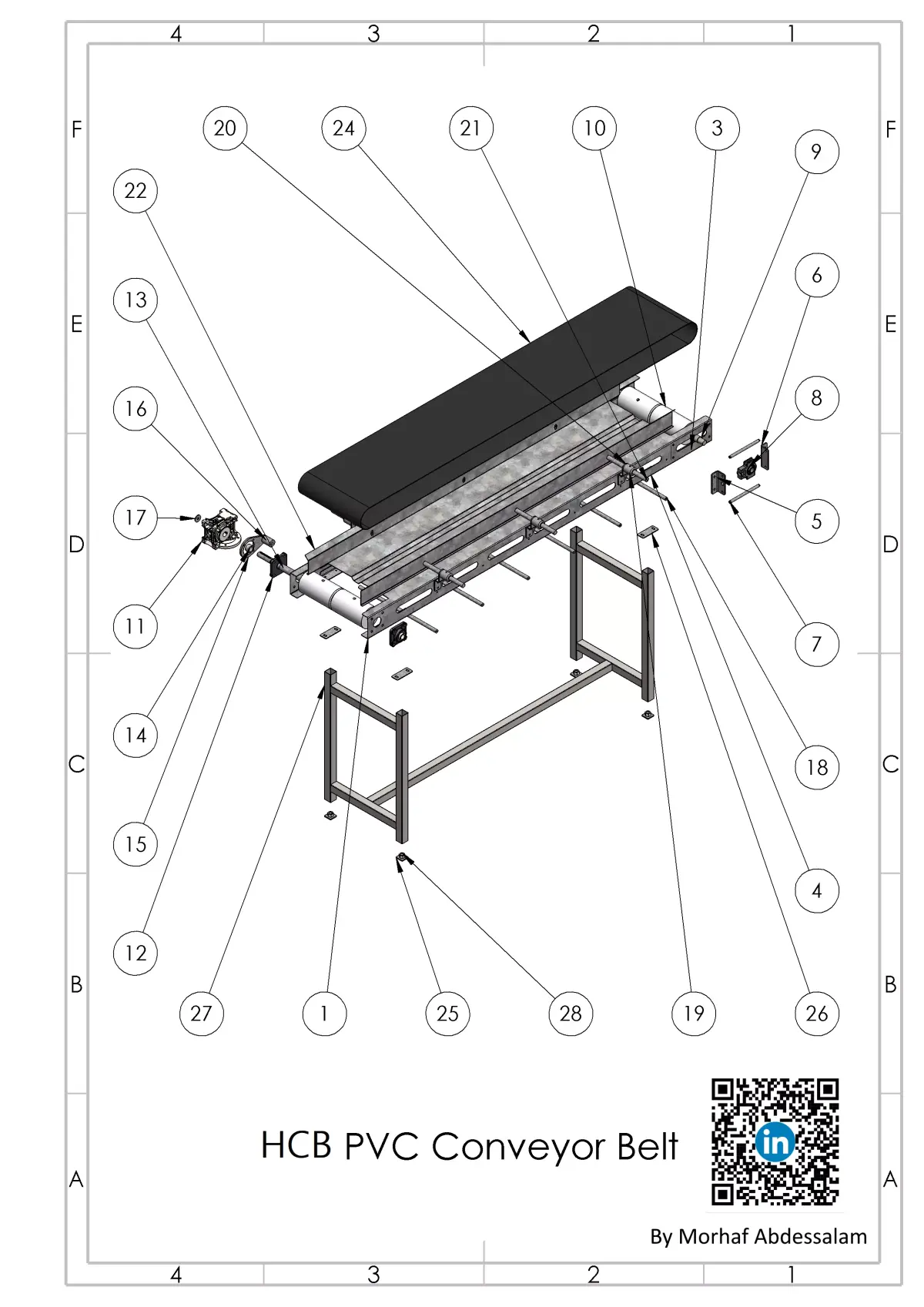This comprehensive 3D model, developed in SOLIDWORKS 2025, represents a fully engineered horizontal PVC conveyor belt system, designed for real-world manufacturing. The package includes a complete set of production-ready files: DXF files optimized for laser cutting, plus detailed general arrangement and assembly drawings in both PDF and SLDDRW formats , featuring exploded views for straightforward assembly guidance, some of the technical drawings are aploaded within preview images.