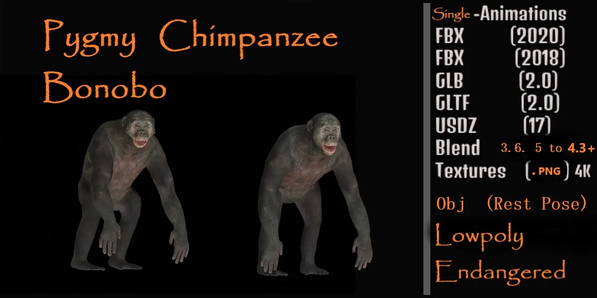 The bonobo, also historically called the pygmy chimpanzee, is an endangered great ape and one of the two species making up the genus Pan .3D Pygmy Chimpanzee Bonobo Animal Model By Nyilonelycompany.