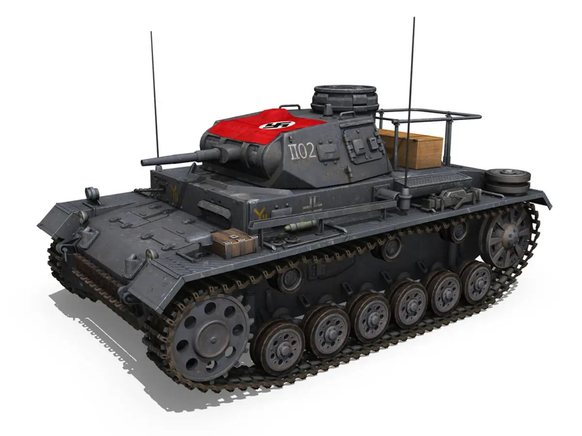 Command version of the Panzer 3 Ausf.E. The main gun and all the equipment associated with it had been removed to make way for extra radio equipment, and so a dummy gun barrel was put in place. The main turret itself was bolted in place and as a result the turret mounted machine gun, which was the only weapon carried on the Panzerbefehlswagen III, had a limited 60 degree traverse. The main identifying feature of the Panzerbefehlswagen III was the large frame antenna required for the FuG 8, which resembles a hand rail placed around the rear deck of the tank.