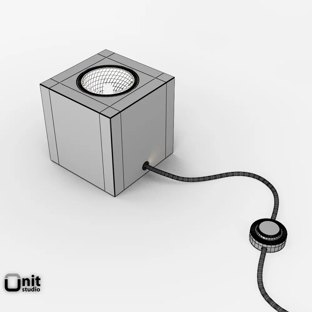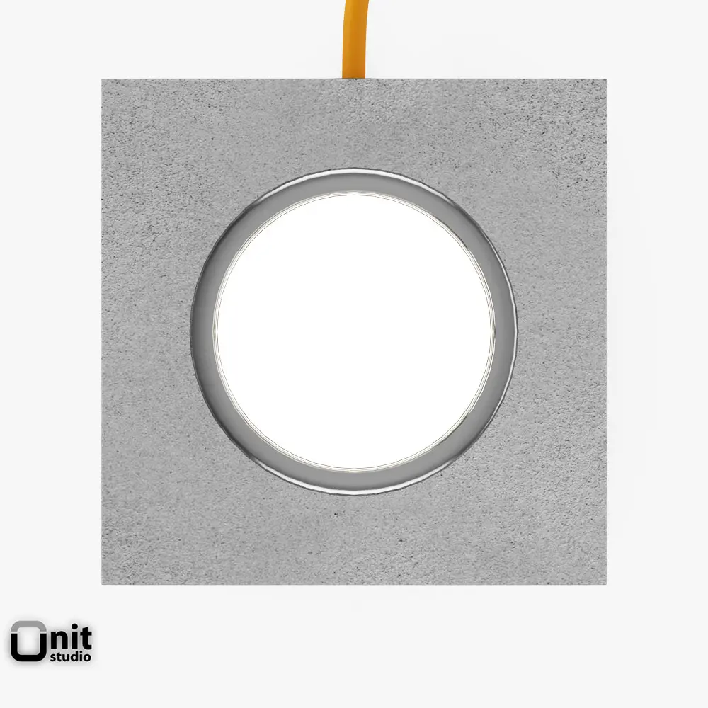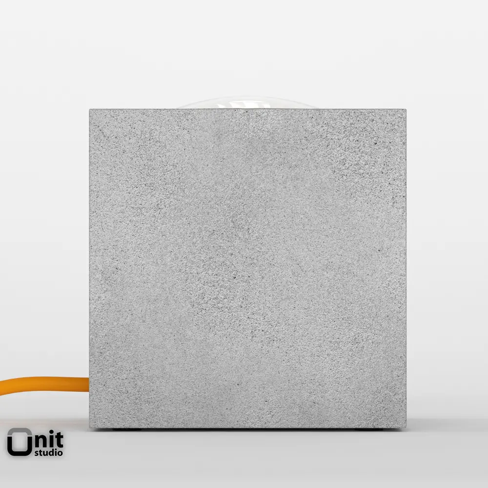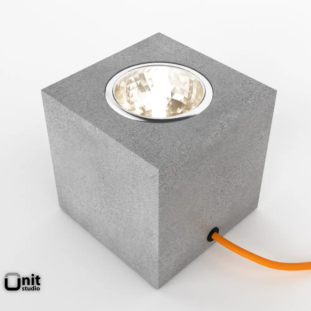 Q Lamp: a floor light into a cube of concrete with an orange cable. By Davide Groppi. Design Alberto Zattin