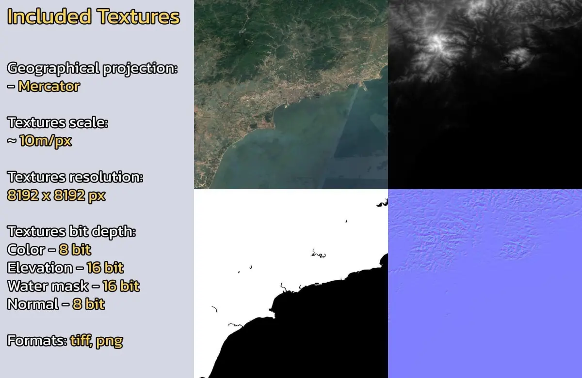 Warning: minor clouds/artifacts may be present on the diffuse color satellite texture due to the nature of the dataset. Check product images.