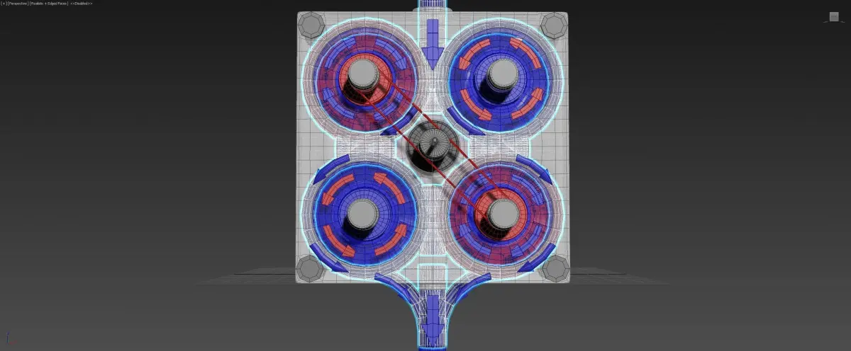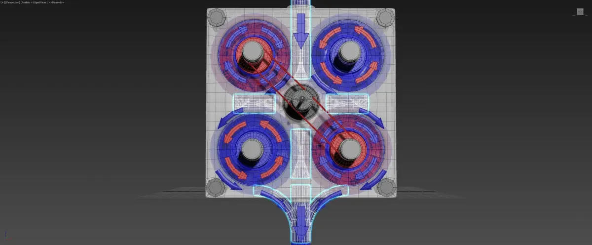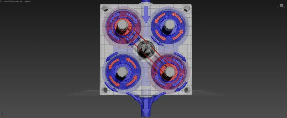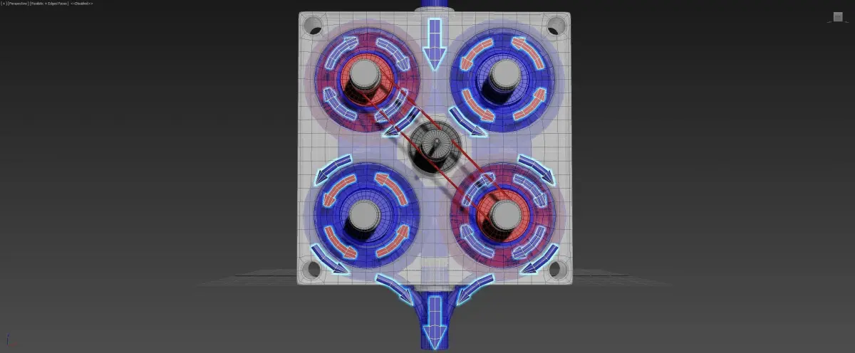 4 tesla turbines combined to work together, powering a single center axis. we can expand the design to infinity, just add a longer axis, add one or two Quadro [3d printable] squares, keeping forces on the main axis balanced, connect a single water or air pressure, and all will be well. warning: do not, i repeat, do not try to power a bike or car with it, by placing them close to the wheels with a differential between them because they dont like people driving on air or water.