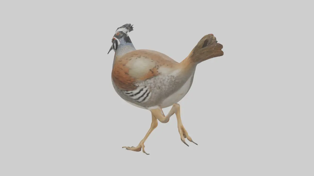 Description: 3D model of a running quail with detailed textures and realistic design. Ideal for animal-themed projects, animation projects, or 3D printing. Models include FBX, OBJ, GLB, USDZ, STL, and BLEND file types.
