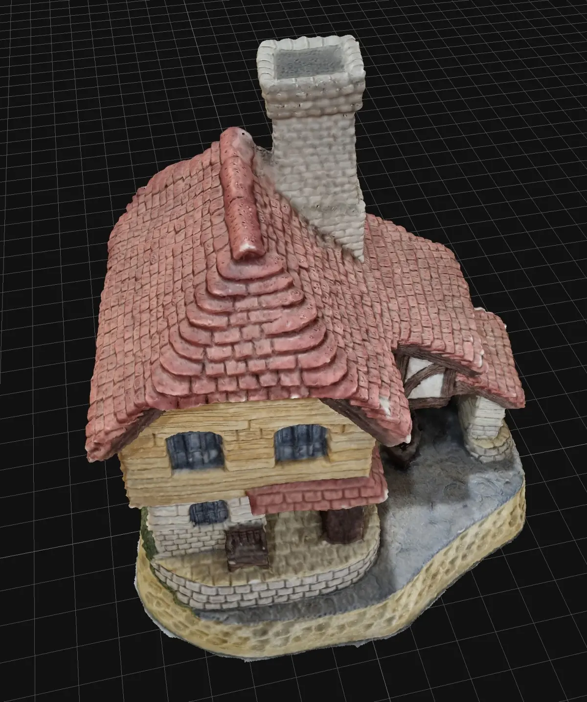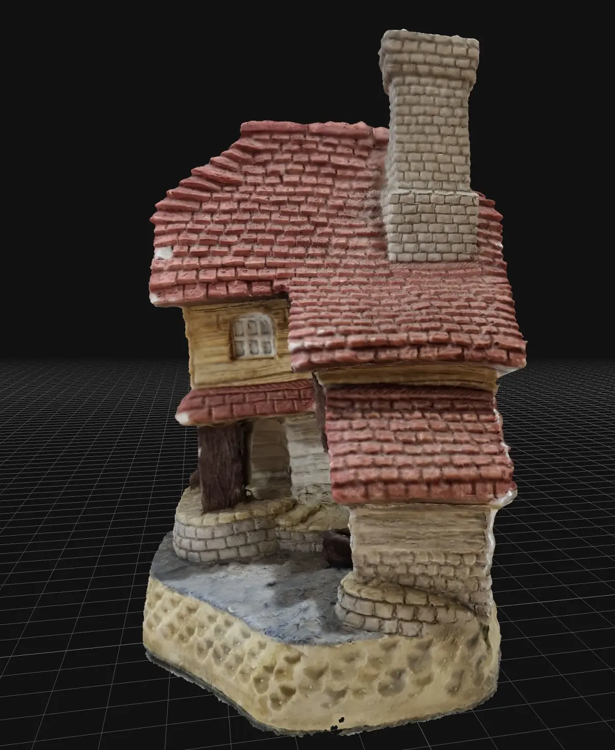 This is a model of a quaint little house. It has a garage with a canoe in it. This is the outside only. Has a porch with a wooden chair and a walk through from the front door.