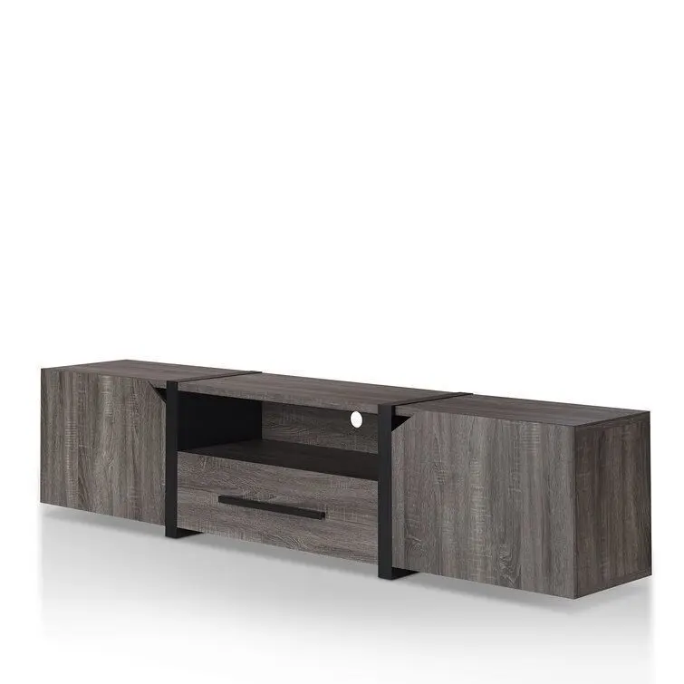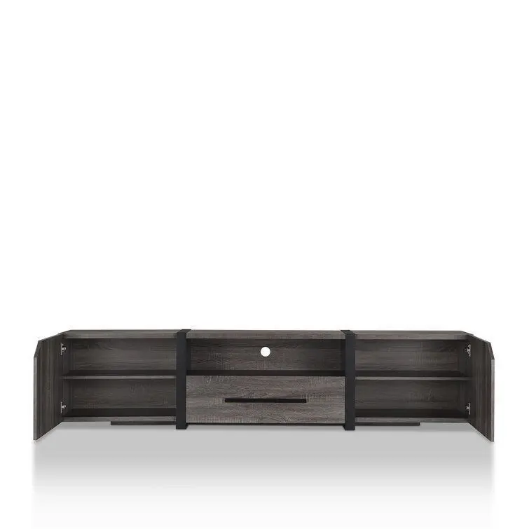 - Fusing function with fashion, this transitional TV stand is an ideal anchor for any classic or contemporary entertaining ensemble. Its clean-lined frame is crafted from solid and manufactured wood with a neutral solid finish. The top is perfectly suited for your flat-screen, while an open shelf with an opening for wires, a single drawer, and two cabinets let you keep all your DVDs and players on hand.