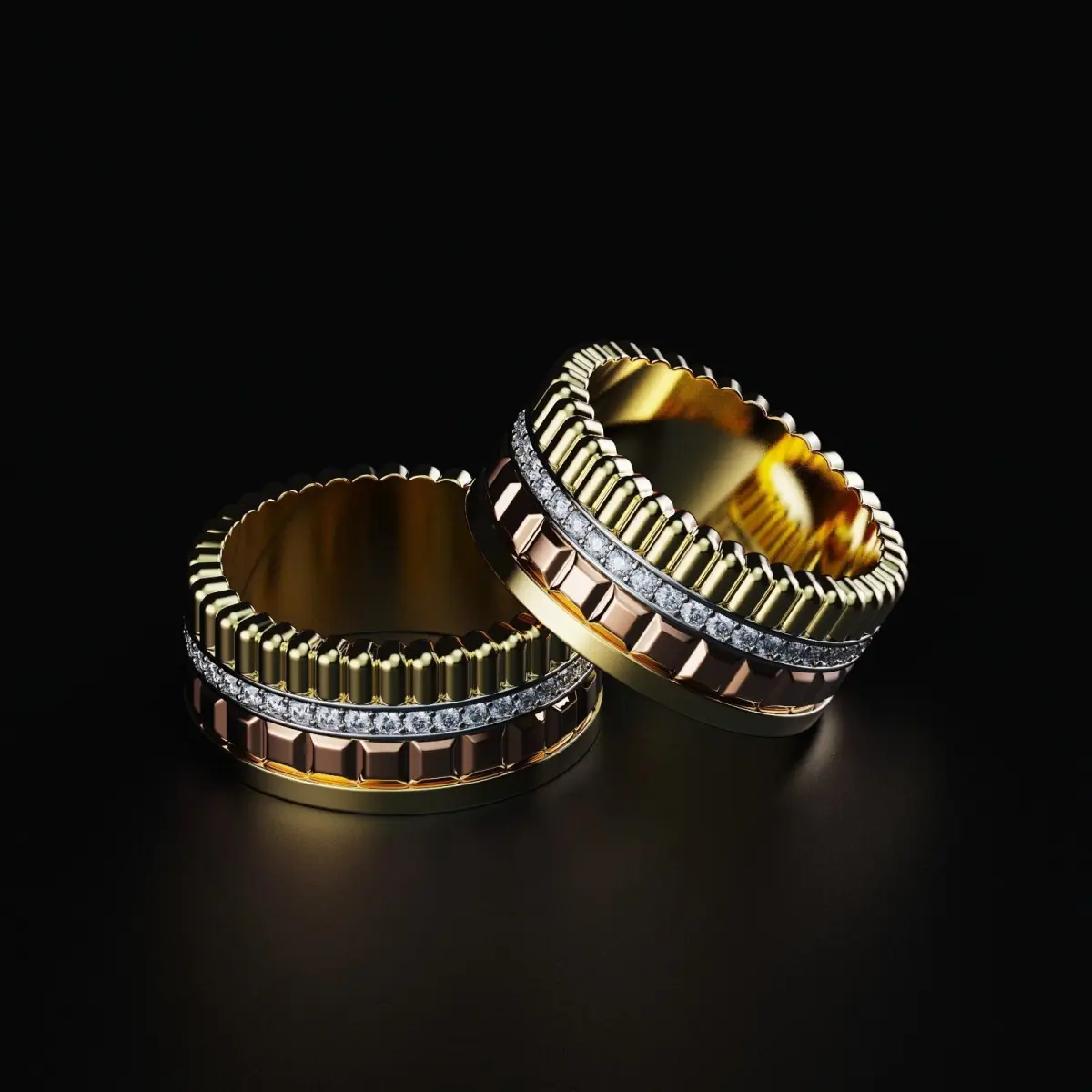 This collection of rings is ready for 3D printing.Ring sizes 15.5 16 16.5 17 17.5 18 18.5 19 mm. Approximate weight of rings by size(GOLD 14K): 15.5mm-8.49g 16mm-8.74g 16.5mm-8.98g 17mm-9.23g 17.5mm-9.48g 18mm-9.73g 18.5mm-9.97g 19mm-10.22g. Width - 8.1mm. Thickness - 1.7mm. Round stones - 1.2mm. I can make to order with your parameters.