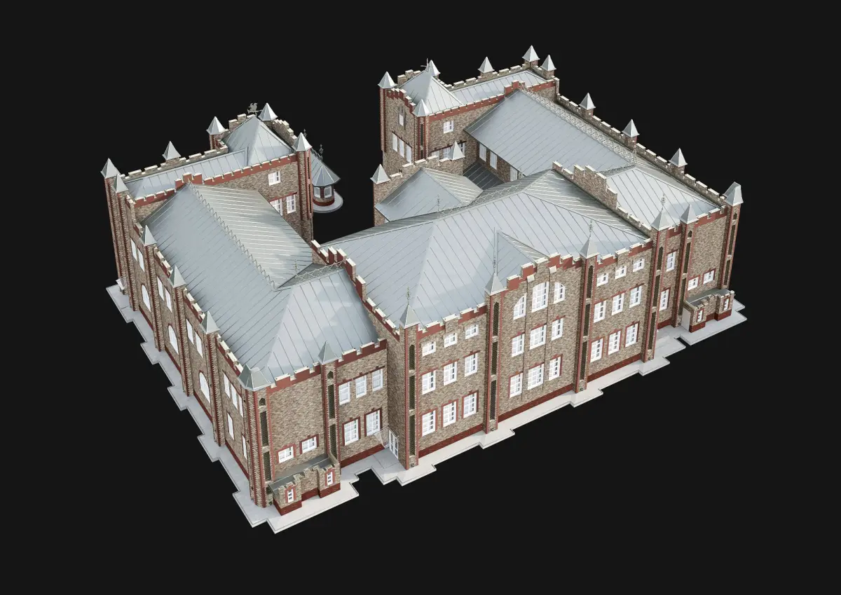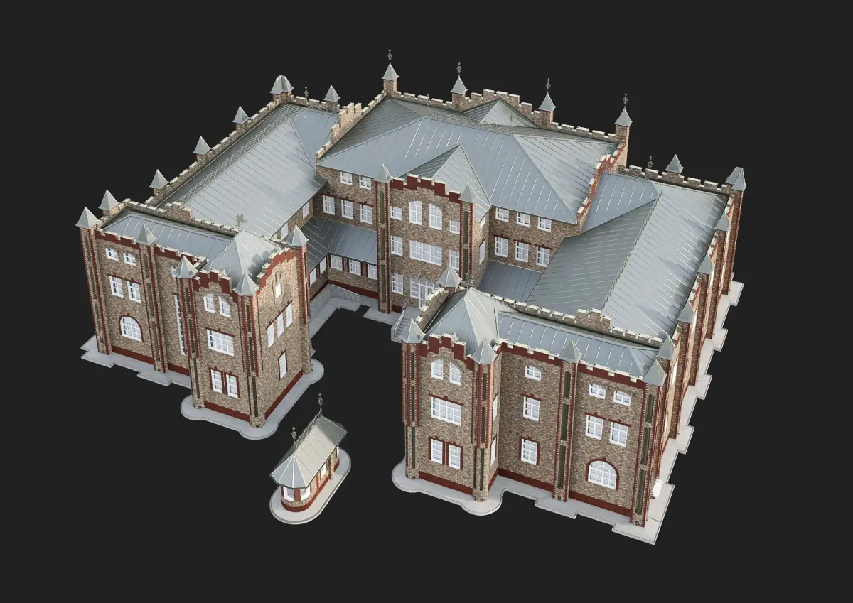 Features: - High quality polygonal model - 3ds Max model is fully textured with all materials applied. - All textures and materials are included and mapped only in 3ds max format. - Max models grouped for easy selection - curtians models in ewery window - No cleaning up necessary, just drop your models into the scene and start rendering. - No special plugin needed to open scene. -The file contains only the building itself and the guard post. - Surroundings, cars and decorations presented in the title picture is not included.