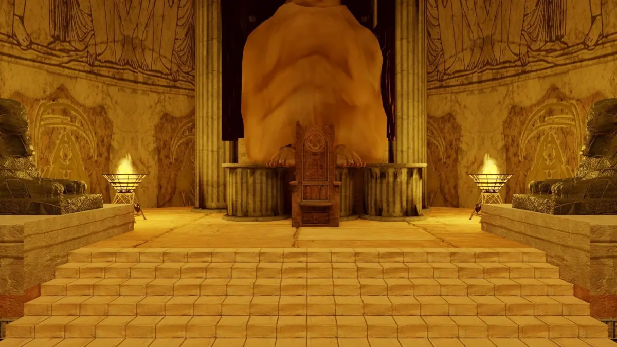 Behind the throne stands a giant Judgment Statue, carved from ancient stone and blessed by forgotten gods