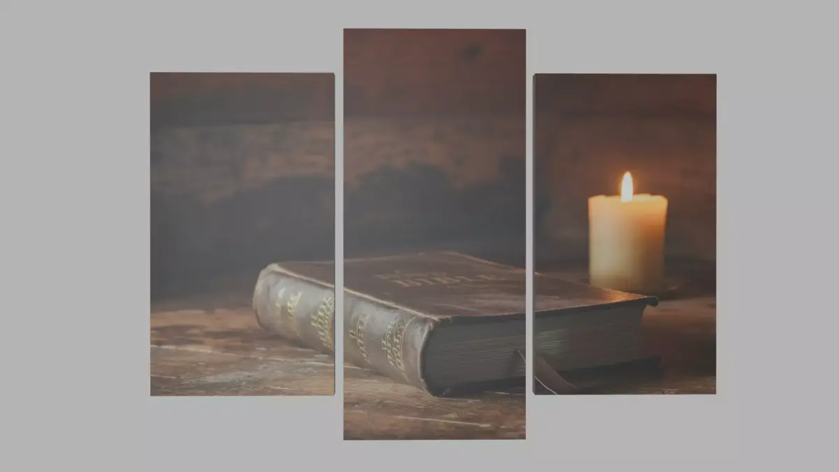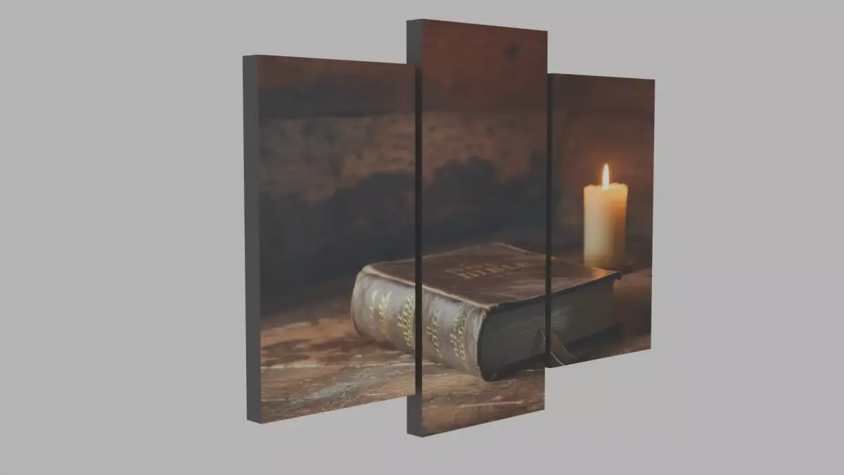 This evocative wall art piece, titled “Quiet Reflections,” captures a moment of peaceful solitude and faith. It portrays an old, time-worn Bible resting on a rustic wooden desk inside a cozy log cabin, illuminated by the soft glow of a single candle. The gentle light dances across the pages, filling the scene with warmth and reverence. Rich textures of aged wood and candlelight create an intimate, vintage atmosphere that invites quiet thought and devotion. The artwork is divided into three coordinated panels, adding depth and balance to its presentation. Perfect for studies, reading nooks, or places of worship, this piece brings a sense of calm and spiritual reflection to any space.